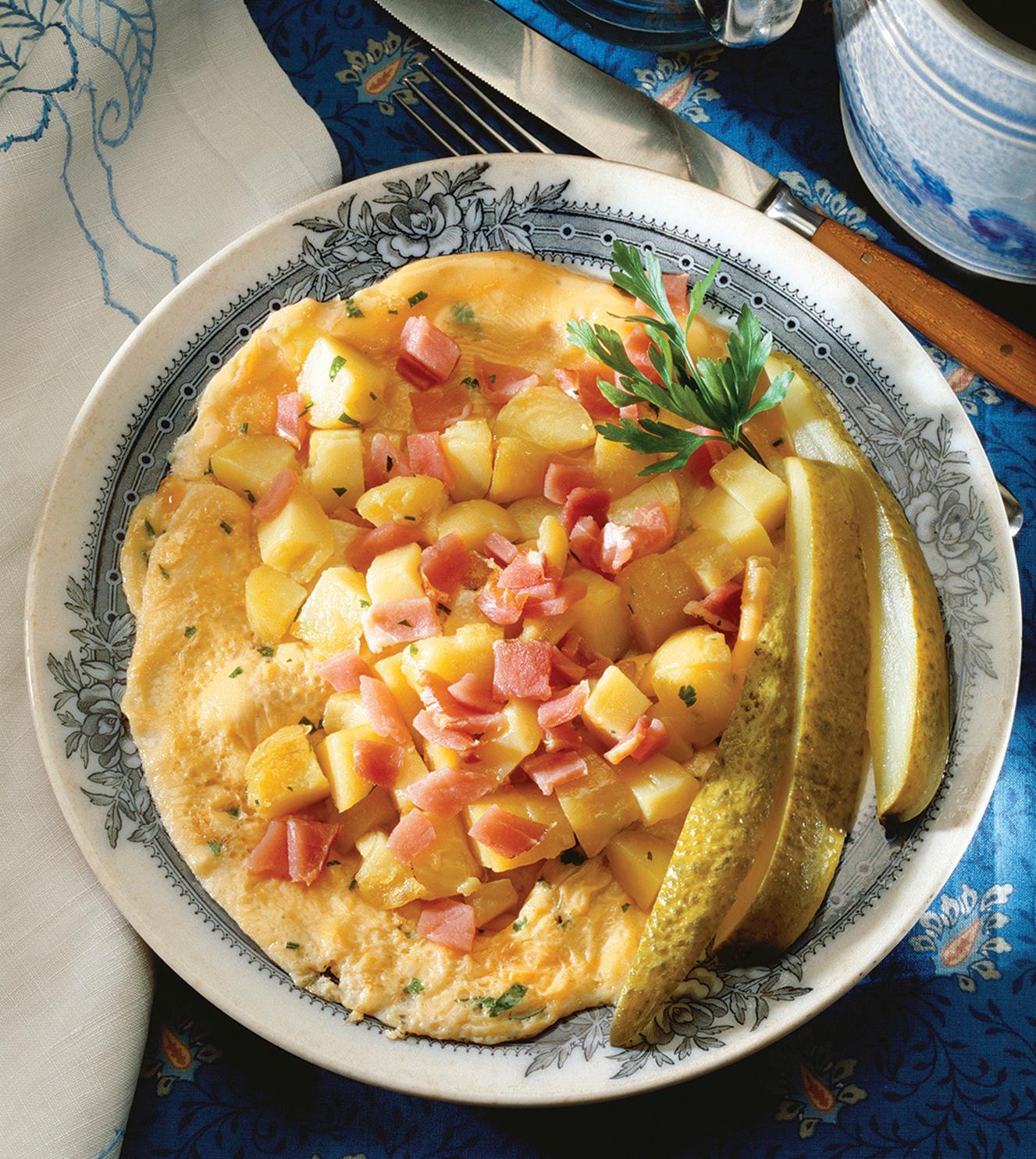 3. Slide cooked omelet onto plate. Season with freshly ground black pepper and top with potato and ham mixture. Garnish with fresh parsley and sliced pickle. Serve immediately.