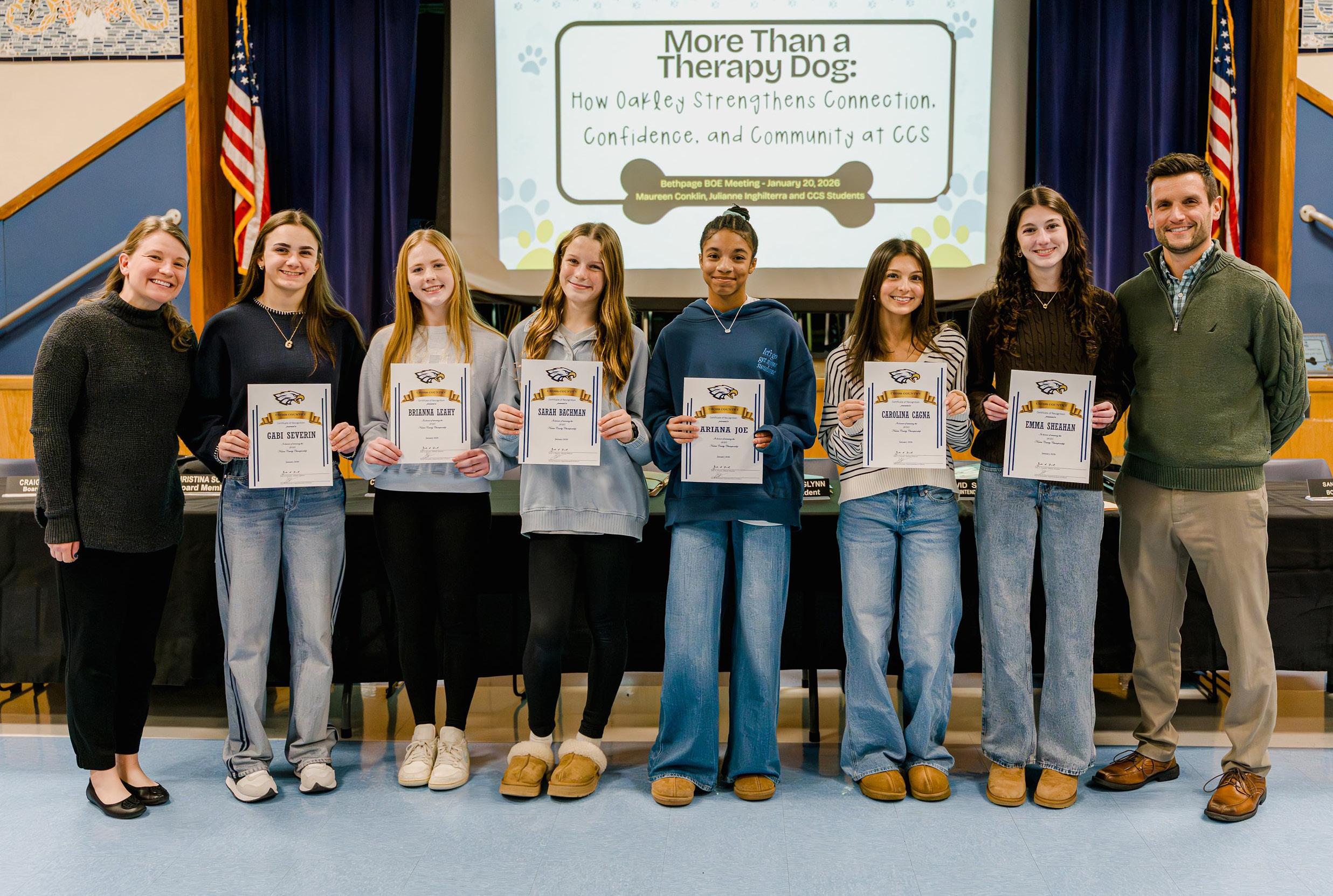 The Bethpage Board of Education convened at Charles Campagne Elementary School on Jan. 20, opening the meeting with recognition of athletic excellence and an inspiring presentation on the school’s therapy dog program.