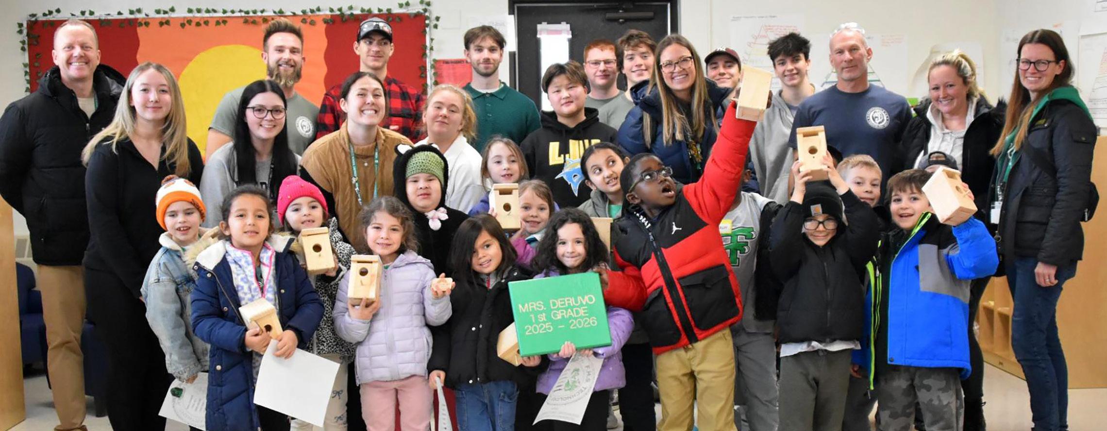 Community pride shines as Ms. Kate DeRuvo’s class joins technology students, Woodward Parkway Principal Dr. Patrick Klocek, and Farmingdale Board of Education Members George Andriopoulos and Kathy Lively for a photo. The first graders received handmade birdhouses to remember this special partnership.