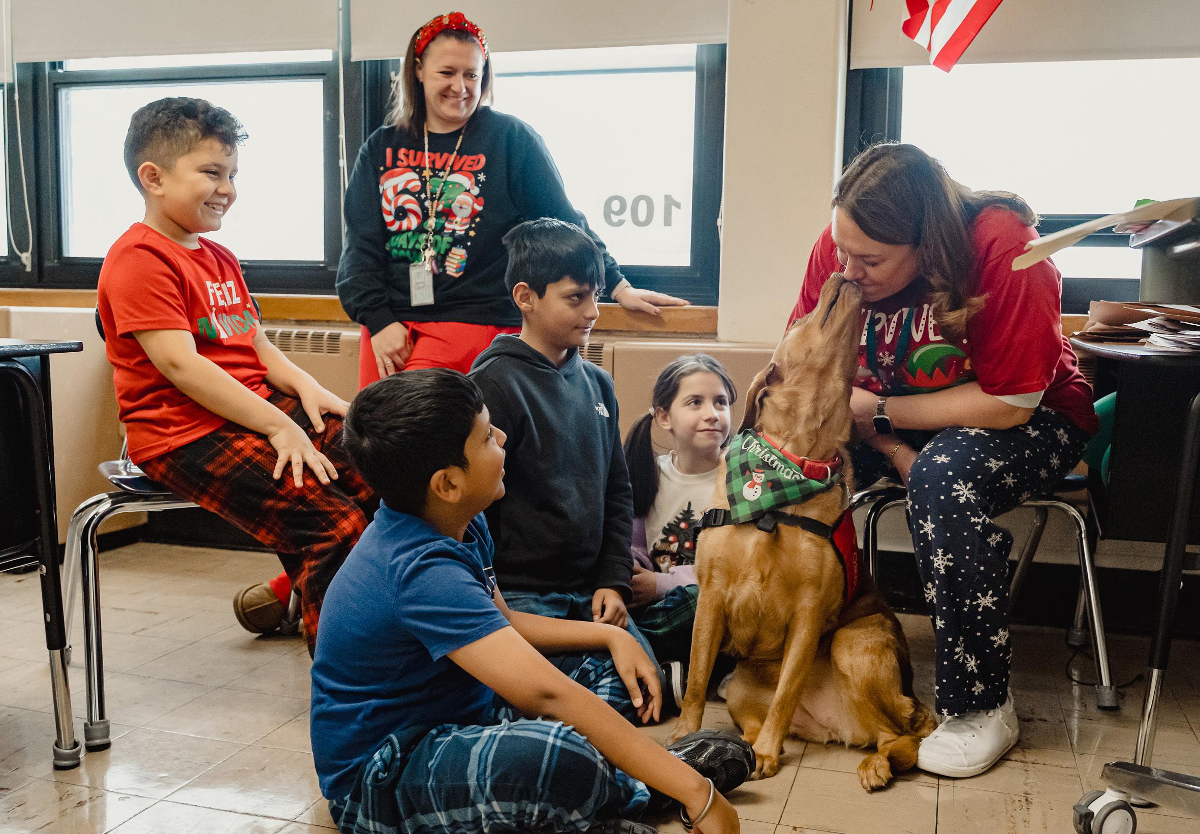 Oakley gives her owner, school psychologist Ms. Maureen Conklin, a kiss – while CCS students and CCS principal Ms. Julianne Inghilterra gather around them. Photo courtesy of Bethpage Union Free School District