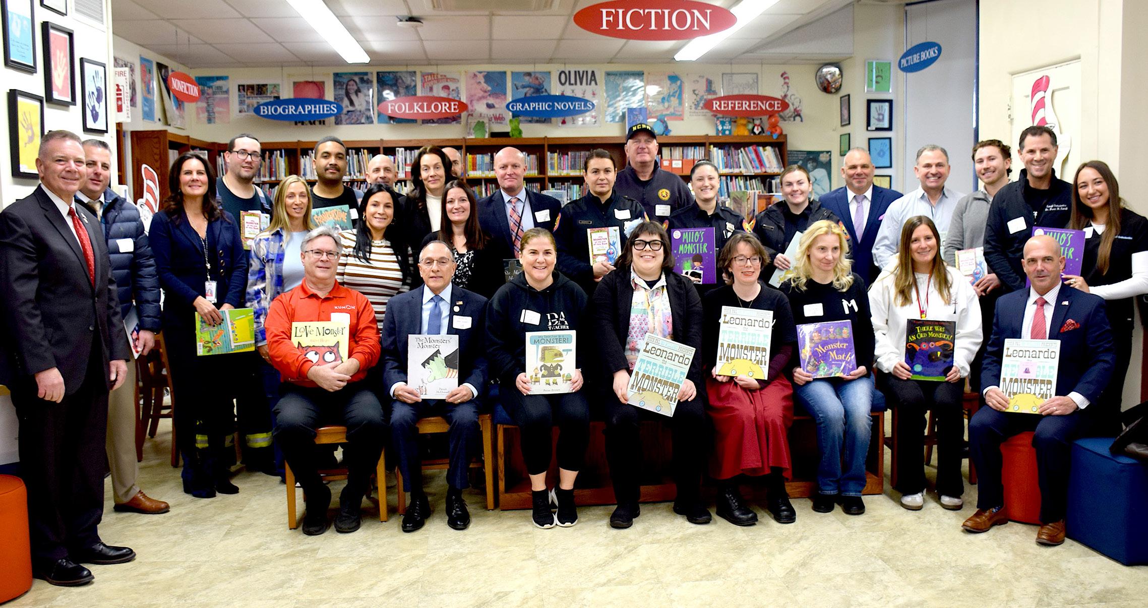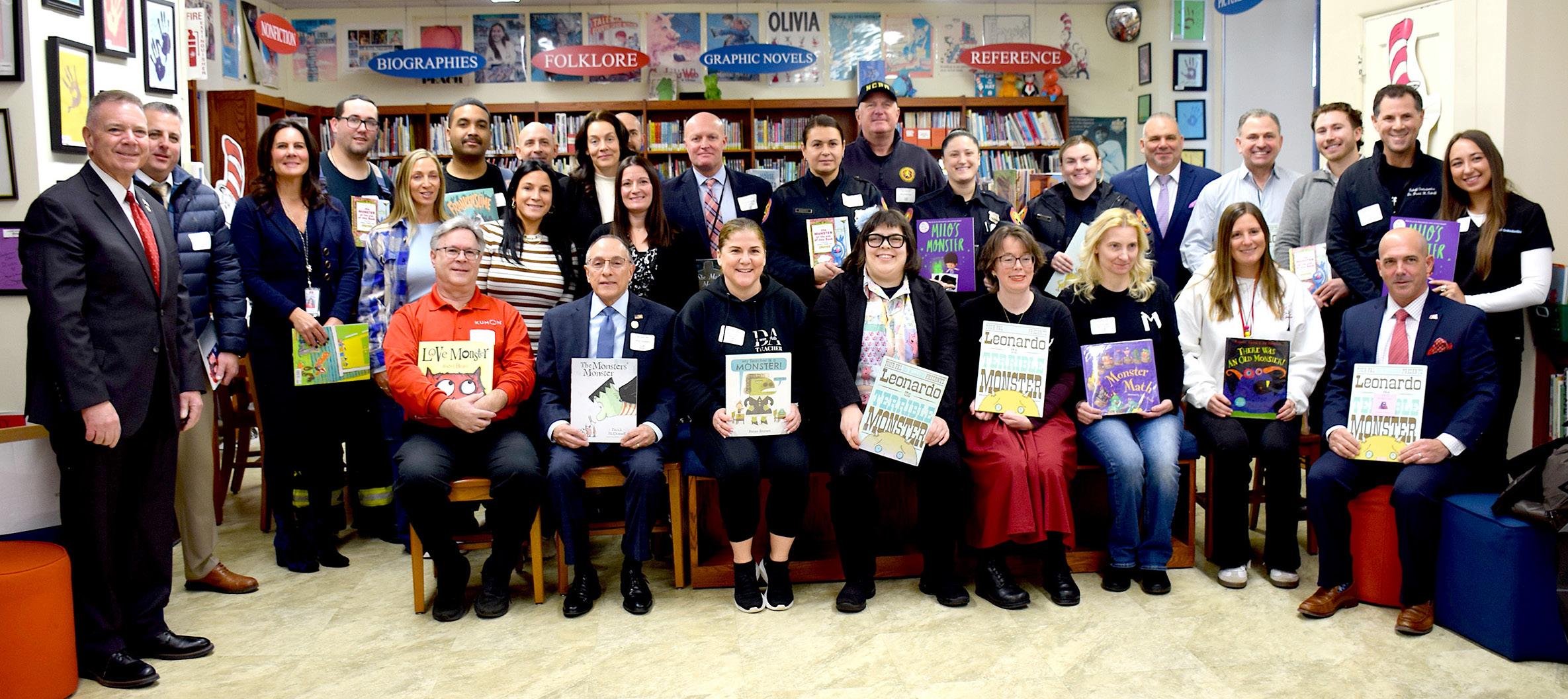 CCS students show off some of the letters they have written to their penpals (along with Oakley, center). Photo courtesy of Bethpage Union Free School District