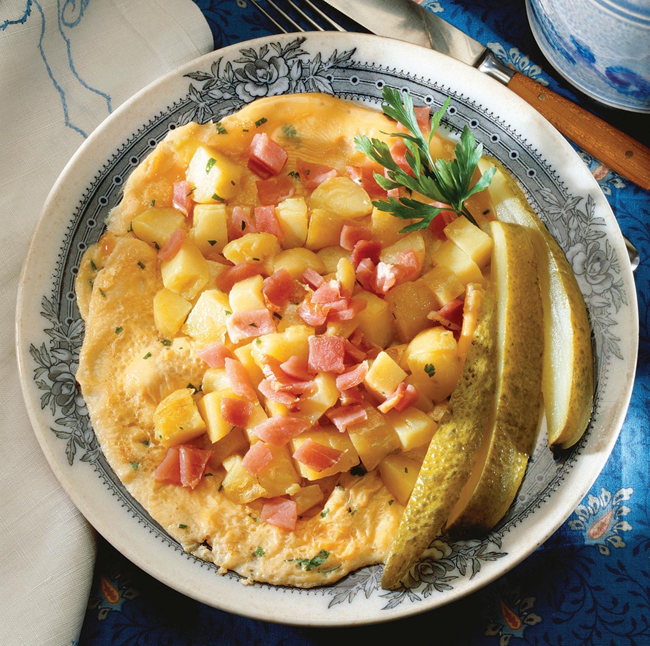3. Slide cooked omelet onto plate. Season with freshly ground black pepper and top with potato and ham mixture. Garnish with fresh parsley and sliced pickle. Serve immediately.