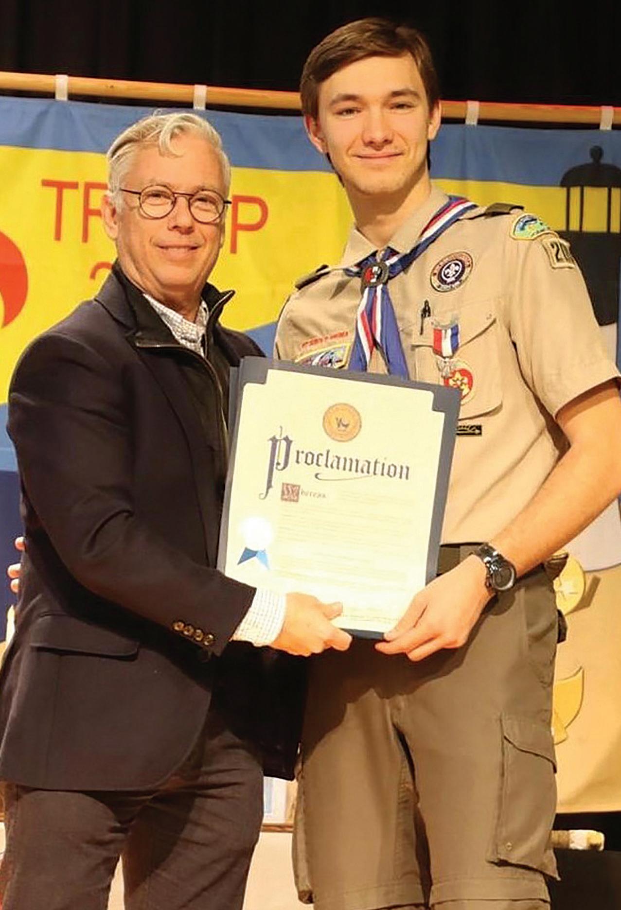 Legislator Steven J. Flotteron recently recognized James Quinn Kelly of East Islip with Troop 205 on being their 106th Eagle Scout at his Eagle Court of Honor at the Timber Point Elementary School. James’ Service Project, earning him Eagle Scout status, was repainting the welcome sign and mulching and refurbishing picnic tables around the area. He is currently a senior at East Islip High School where he excels academically, has been a scholar athlete in soccer and track and will graduate with 11 Advanced Placement classes. In addition, James is a two time Top Engineer and Class and School Robotics Championship winner.