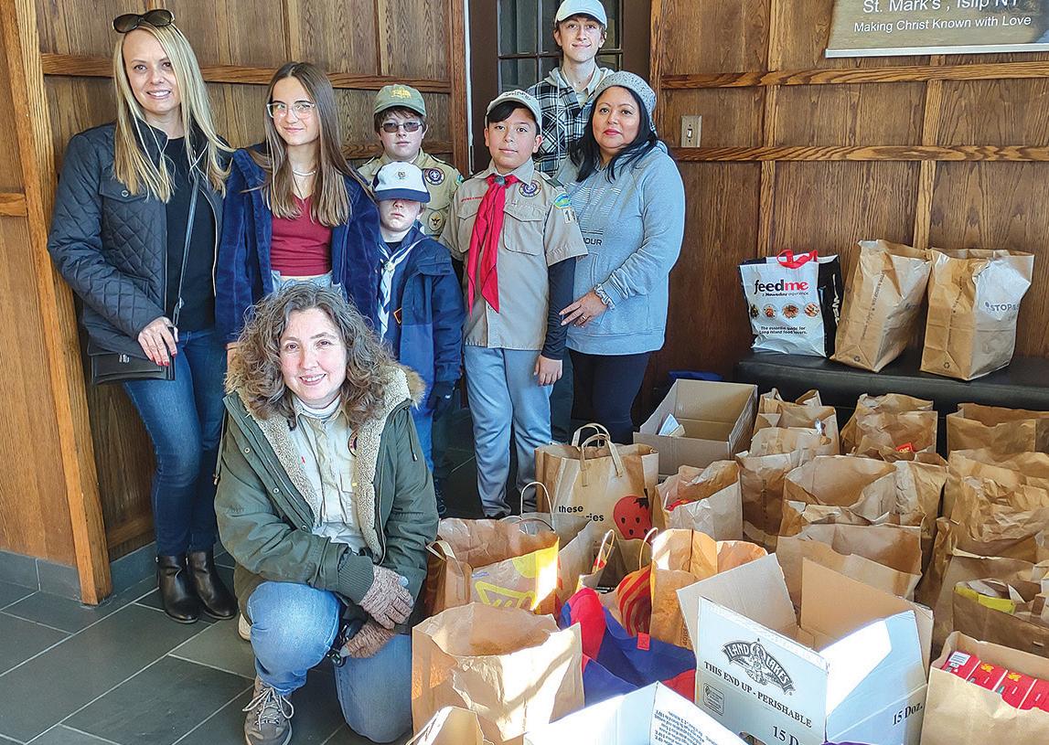 FOOD DROP - Left to right, Laura Rogacki, CEO with Karen O’Malley, Administrator, traumatic brain injury department, Little Angels Center. Kneeling is Karen Pearsall, St. Mark’s parishioner and den leader, Cub Scout #438, Bohemia. They are all flanked by various cub scouts. Photo courtesy of Irene Ross
