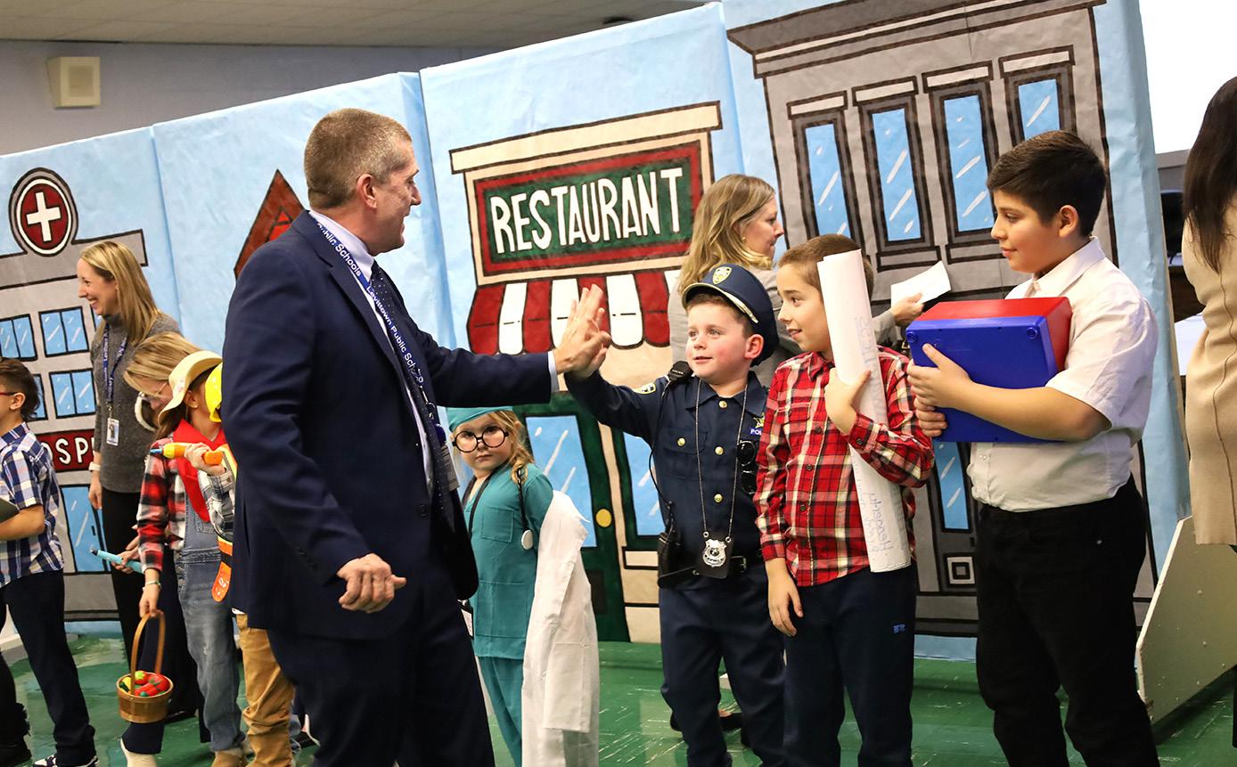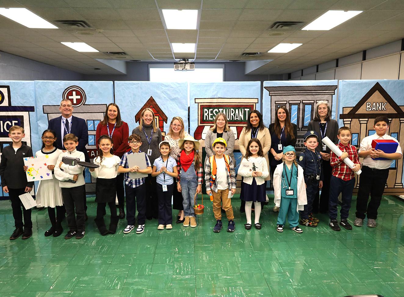 In front of backdrops representing places of work like a library, police department and a hospital, students from all five Levittown elementary schools dressed for the matching job. They discussed the many things they have learned in the Career