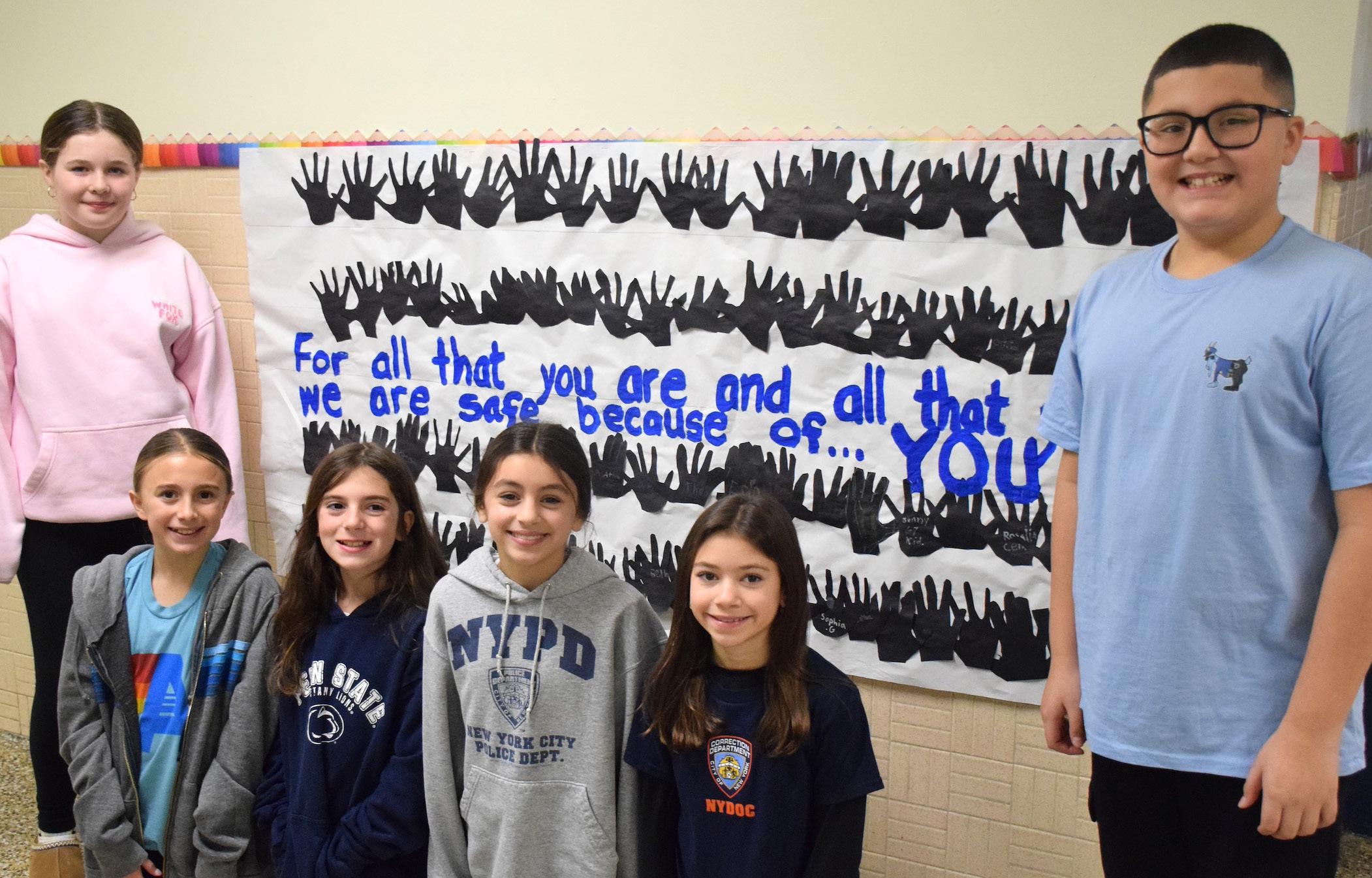 The Unqua student council, including fifth graders, from left, Kaia Young, Jayla Spina, Arianna Maggio, Olivia Moreno, Stella Sollitto and Lucas Giovaniello, made appreciation banners for local police officers.