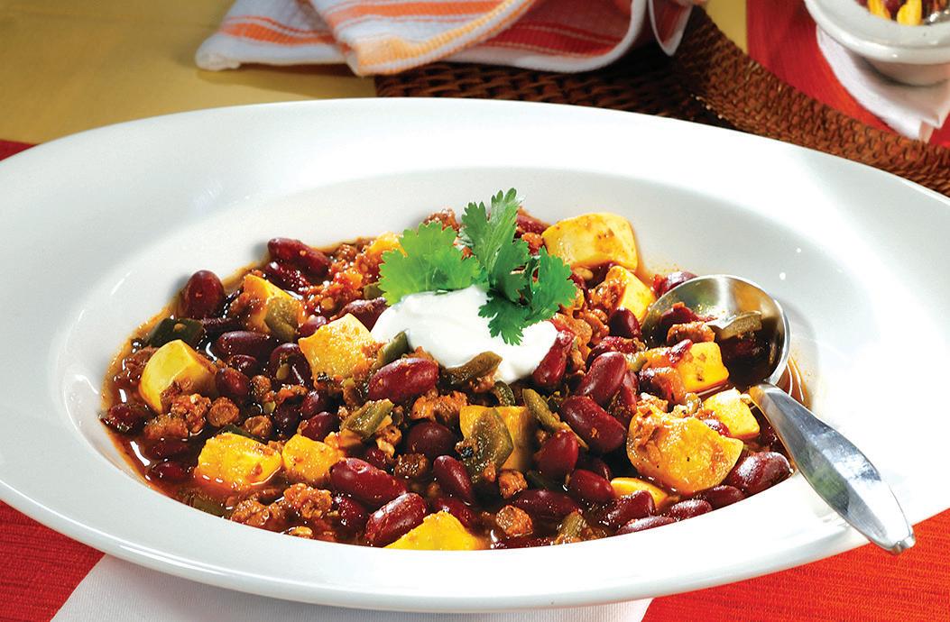 DIRECTIONS: Cook chili peppers and garlic in a large saucepan coated with cooking spray over medium heat for 2 minutes. Add frozen crumbles, chili powder and oregano and continue to cook 1 minute. Stir in salsa. Cover and reduce heat to medium-low. Cook 5 minutes or until chili peppers are tender. Stir in beans and 1 cup water. Stir in squash. Cover and cook until squash is tender, 8 to 10 minutes. Season to taste with salt, if desired. Ladle into shallow bowls; top with sour cream and cilantro. *If fresh poblano chili peppers are not available, substitute 1 or 2 jalapeno chilies, minced and seeded, and add 1 large green bell pepper, diced. If chipotle salsa is not available, substitute your favorite salsa and add hot pepper sauce to taste. Ancho or chipotle chili powder will give the dish more heat than regular chili powder. Beef stock may replace the 1 cup water.
