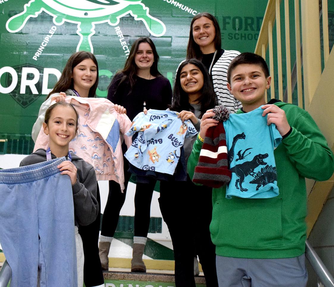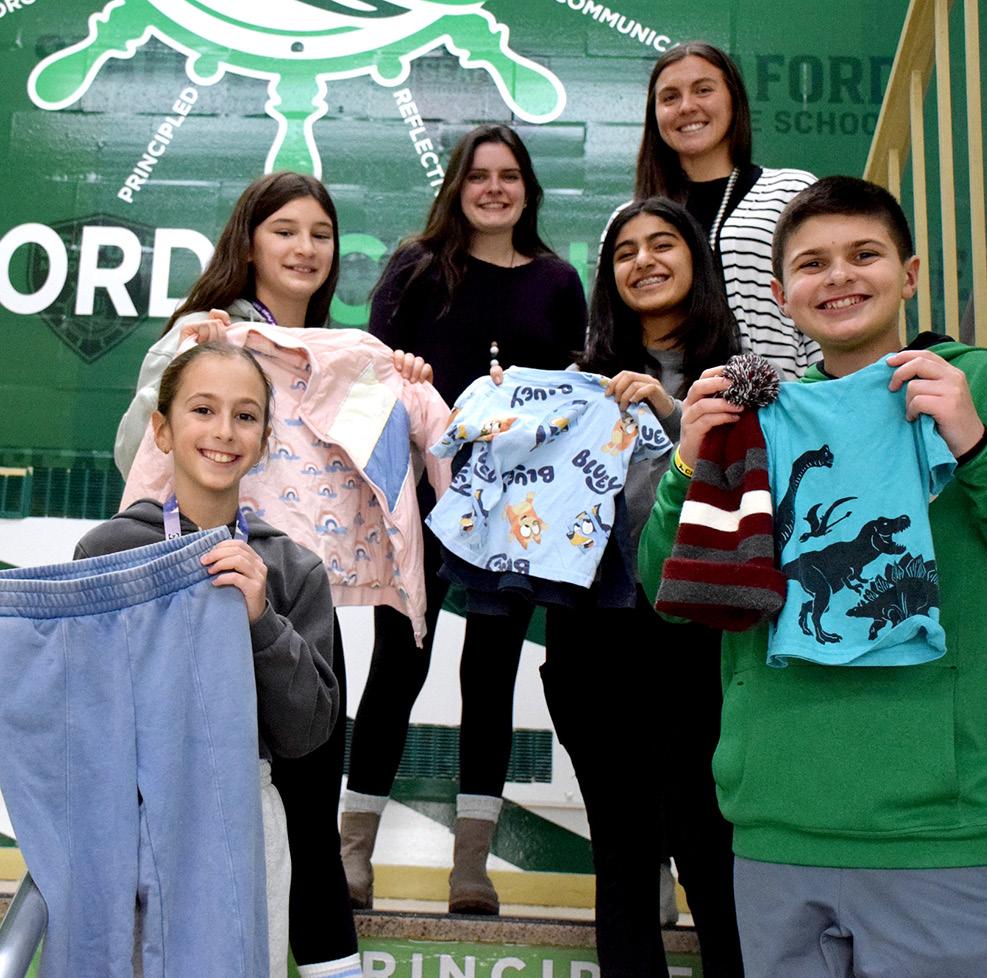 Seaford Middle School Service Club members, from left, Emmeline Hartmann, Lily Sessler, Diya Hathiramani and Ryan Kind, along with advisers Taryn Ohlmiller and Katheryn Hickey, held a monthlong winter clothing drive