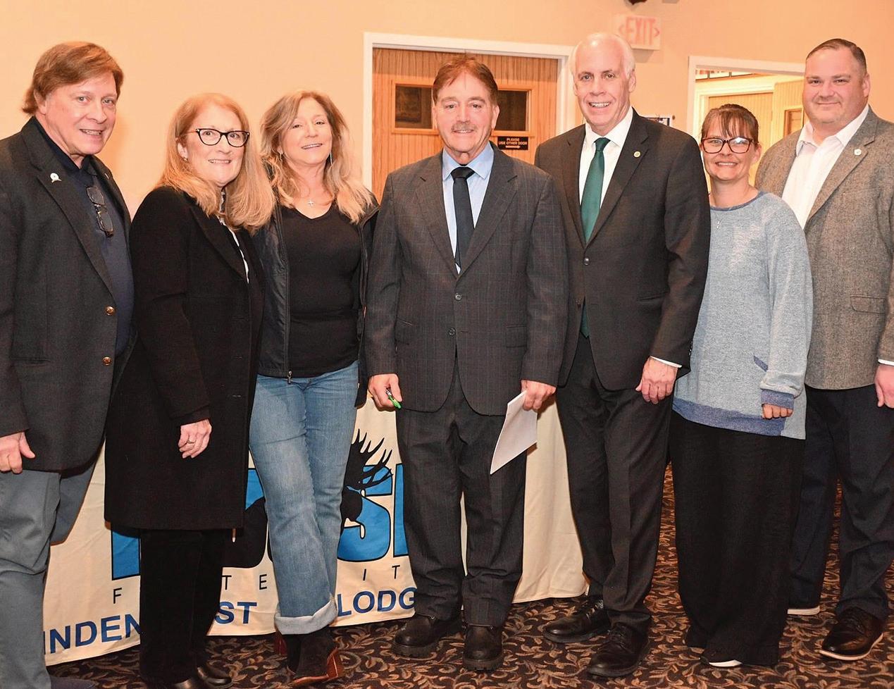 LINDY CARES “SPIRIT OF THE COMMUNITY” EVENt - Lindy Cares hosted the Spirit of the Community event at the Lindenhurst Moose Lodge, which included all of the volunteer organizations to present some of their recent work. Pictured above: Mayor Michael Lavorata, Village Trustee, Maryann Weckerle, Lindy Cares chairwoman Lori-Ann Novello, Village Trustee Douglas Madlon, SCPO Kevin McCaffrey, LCPC LoriAnne Herman, and OLPH Knights Grand Knight Patrick Corcoran.