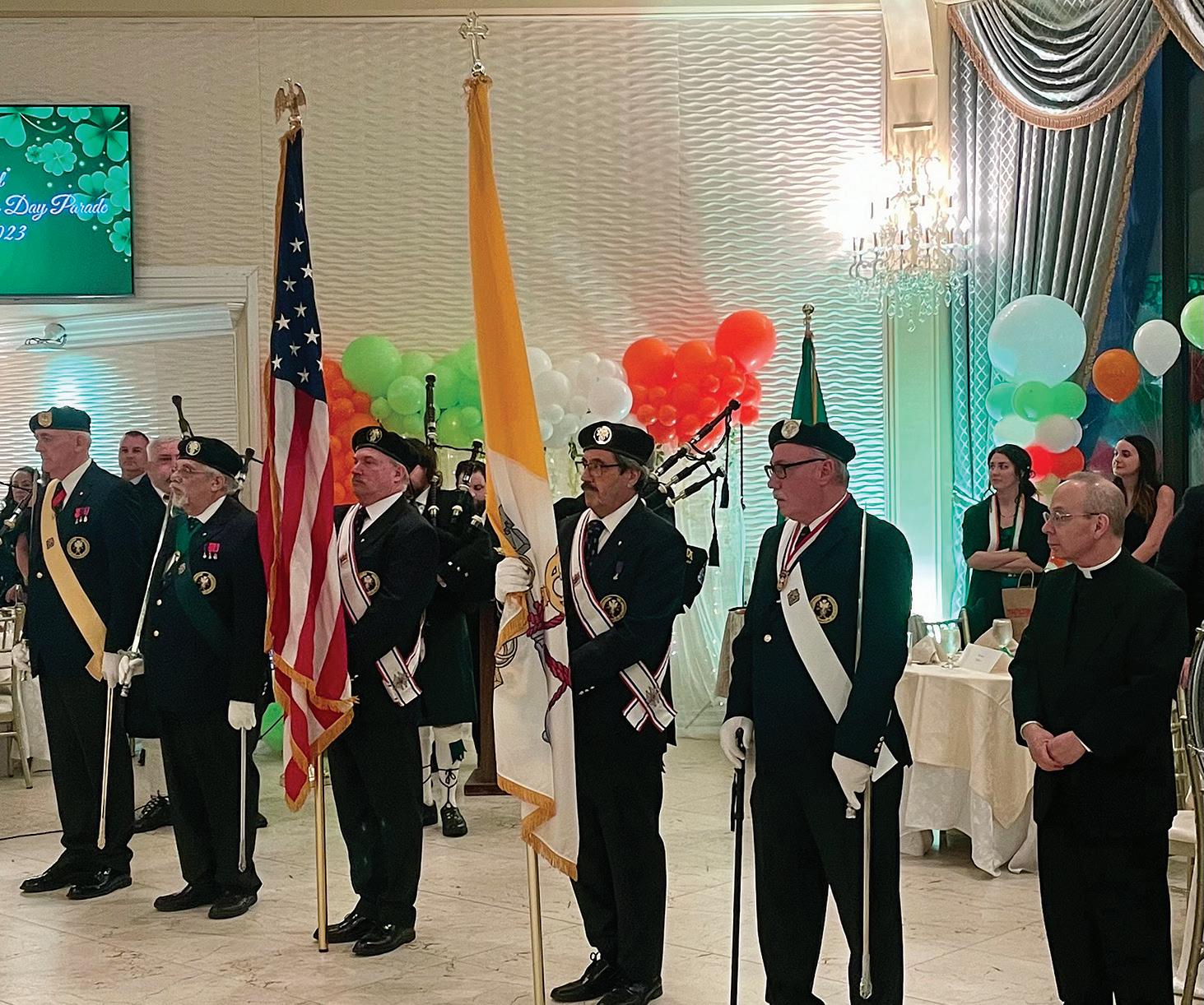 LINDENHURST ST. PATRICK PARADE GREEN-TIE GALA - Our Lady of Fatima Assembly #716 stands at attention along with OLPH Knights Chaplain, Monsignor Joe DeGrocco during the Lindenhurst St. Patrick Parade Green-Tie Gala after leading in the Grand Marshal, Bishop Robert Brennan. The Color Guard was commanded by Master of the 1st NY District Michael Tully. There were over 40 Knights in attendance!