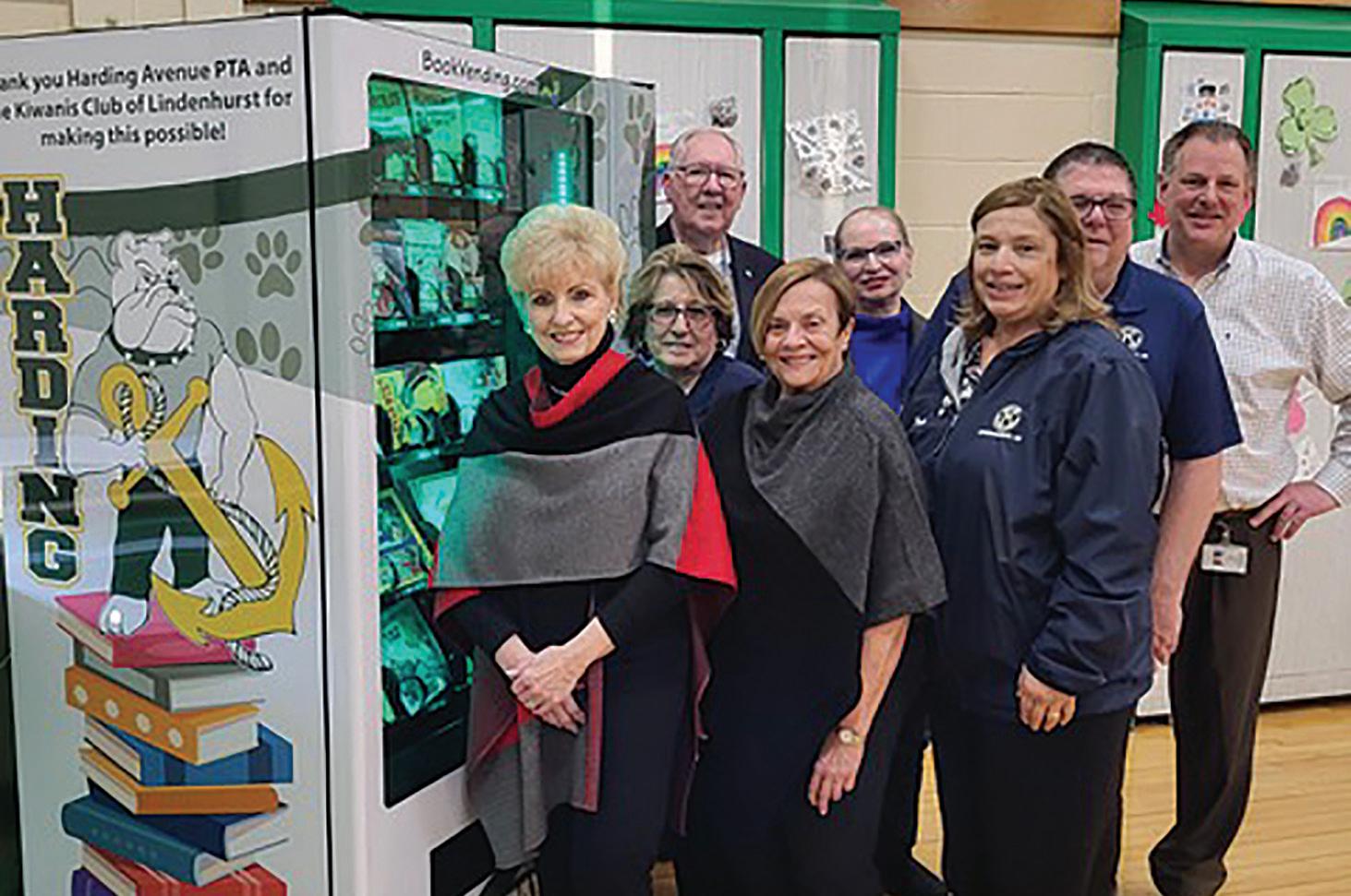 UNVEILING OF BOOK VENDING MACHINE - Members of the Kiwanis Club of Lindenhurst attended the unveiling of a book vending machine at the Harding Ave. School. Parents As Reading Partners (PARP), the school’s PTA, Kiwanis and others funded the purchase of this machine. Students receive tokens as rewards and are then able to use the tokens to choose a book from the machine to keep for their own. Pictured here (front row) are club president JoAnn Boettcher, Angela Petri,