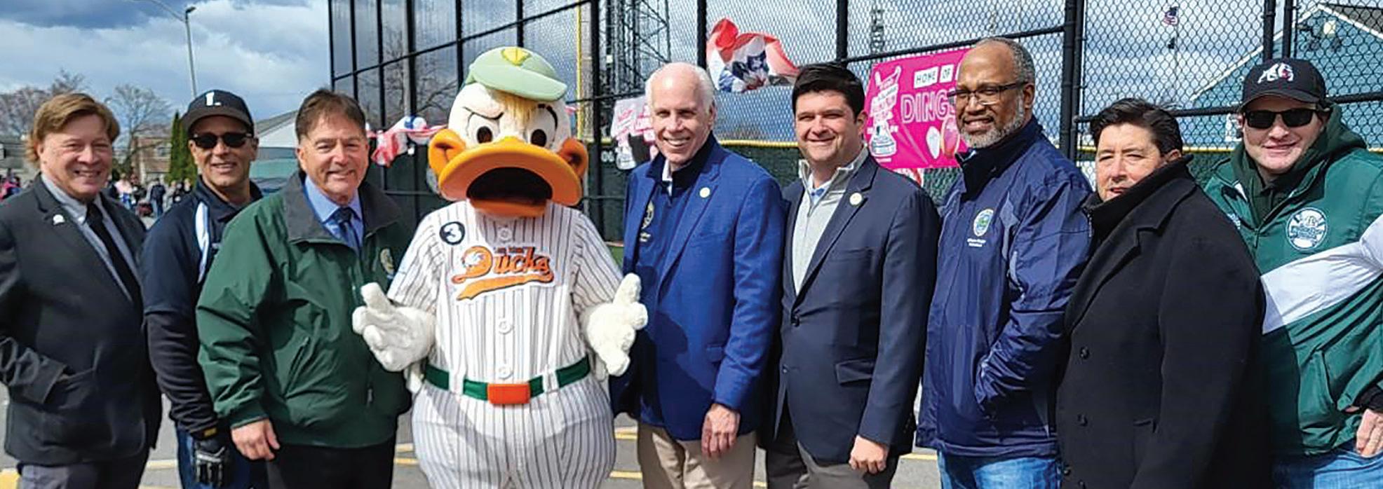 LINDY AMERICAN LITTLE LEAGUE OPENING DAY - Pictured here celebrating Opening Day with the Little Leaguers and Quaker Jack of the Long Island Ducks are (left to right): Mayor Michael Lavorata, LALL President Robert Pacheco, Trustee Douglas Madlon, Quaker Jack, Suffolk County Legislature Presiding Officer Kevin McCaffrey, Babylon Town Councilman Anthony Manetta, Babylon Town Councilman DuWayne Gregory, Village Administrator Joe Barone, and Former LALL President Jason Peckholdt.