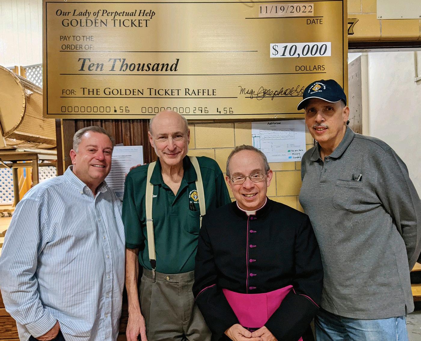 KNIGHTS RAISED $1,000 FOR OLPH - The Lindenhurst Knights of Columbus managed the 50:50 at the OLPH Golden Ticket fundraiser chaired by Meg Danaher and Bob Meade. The parishioners, during the fundraiser celebration, graciously put over $2,000 into the fund which was split with OLPH and the winner! Events like these continue to showcase community support for the foundational organizations around the Village. Below, Brother George Former, Grand Knight Steve Strigaro, Chaplain and Rev. Msgr. Joe DeGrocco and Chancellor Carl Zoccali.