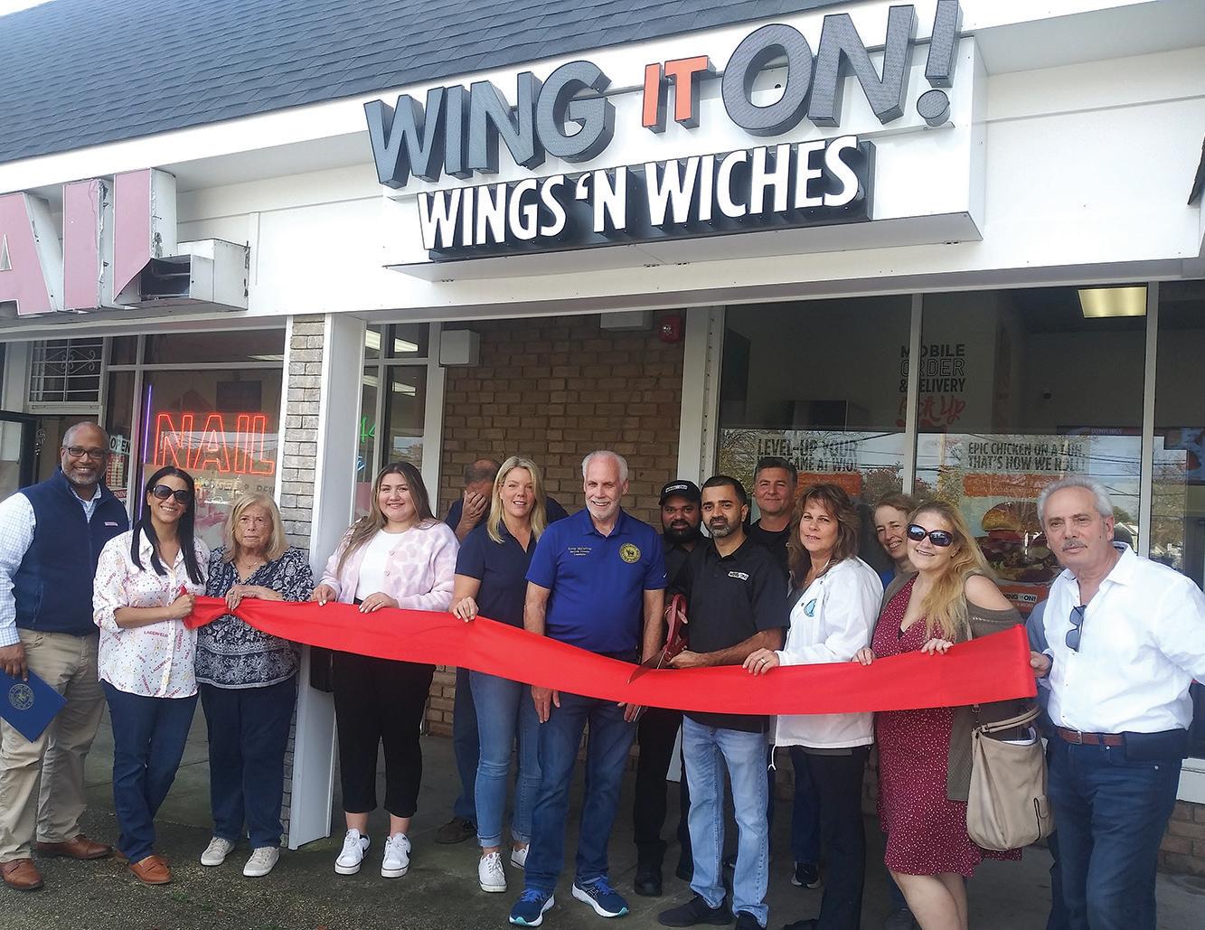 RIBBON CUTTING CEREMONY - The Copiague Chamber of Commerce recently held a ribbon-cutting ceremony to celebrate the opening of Wing It On! - Wings ’N Wiches at 854 Montauk Highway in the Merrineck Plaza Shopping Center in Copiague. On hand to celebrate were owner Sid Kapur, Wing it On! employees, local elected officials as well as members of the Copiague Chamber of Commerce including president Donna Farina. Good Luck! Photo by Bob Liquorie