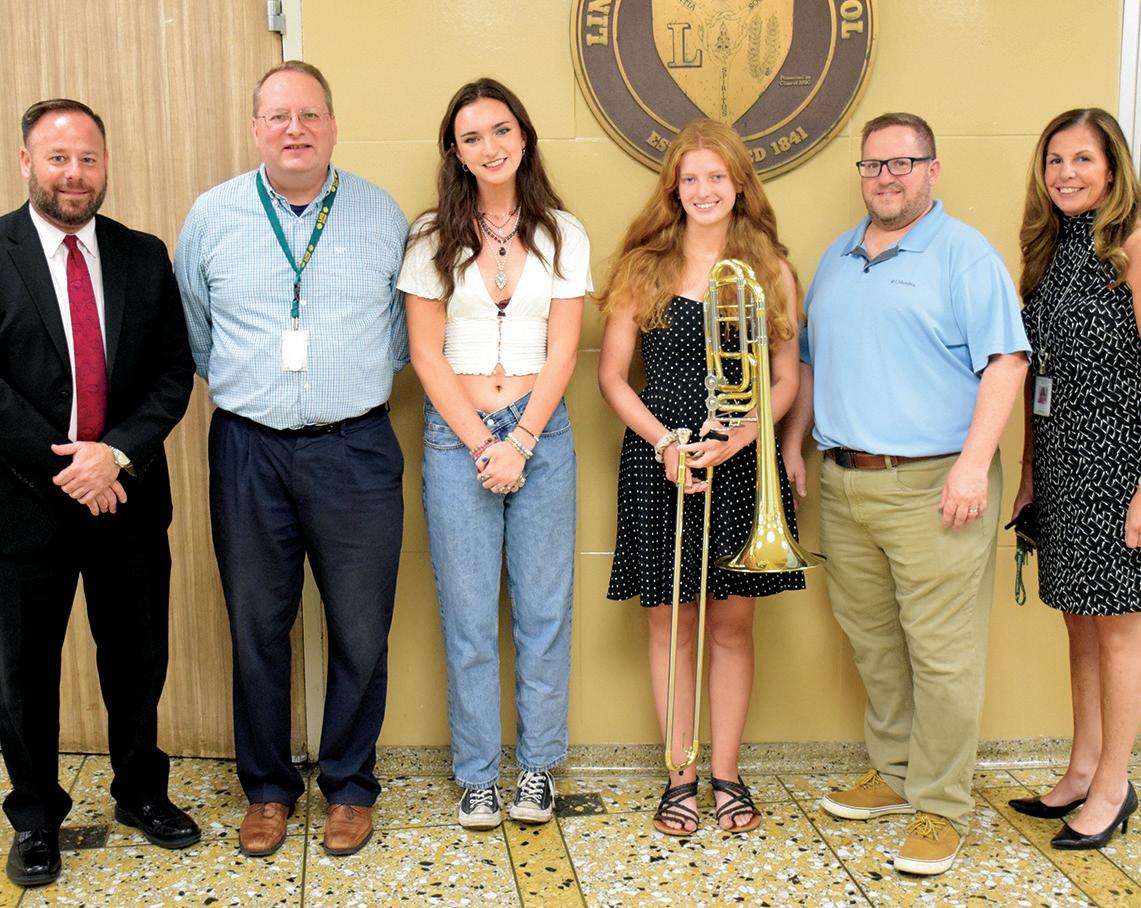 STUDENT-MUSICIANS SELECTED FOR NYSSMA ALL-STATE - Two talented student-musicians from Lindenhurst High School were selected to showcase their musical mastery during the 2022 New York State School Music Association’s All-State performance, which will take place this December in Rochester, New York. L-R –Director of Fine and Preforming Arts Jon Trapani, Chuck Pramnieks, Sinead Buckley, Aurelia Cacace, Kevin Pike and Lindenhurst High School Principal Dr. Candice Brodie. Photo courtesy of The Lindenhurst Union Free School District