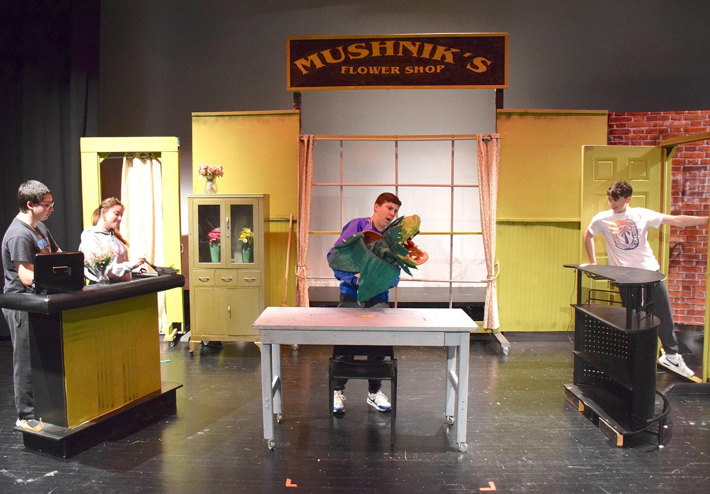 Seymour, with senior Cameron Calderaro as Audrey. Sophomores Roran Cassidy and Henry Brock portrayed Mr. Mushnik and Dr. Orin Scrivello, respectively.