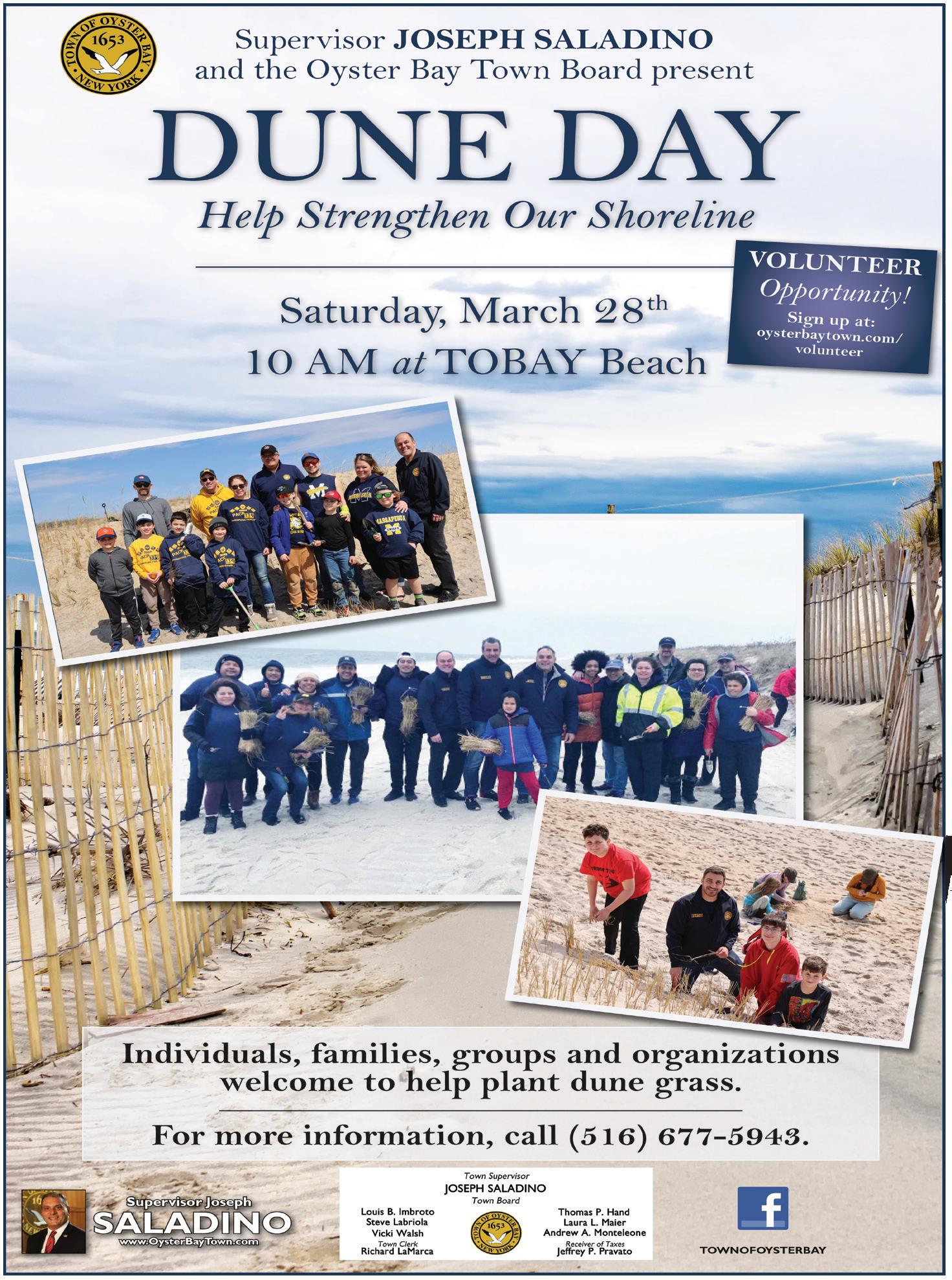 If you love the beach and want to help protect our shoreline, residents are invited to join Oyster Bay Town Supervisor Joseph Saladino and Councilman Andrew Monteleone at the Town’s annual Dune Day on Saturday, March 28th, at 10 a.m. at TOBAY Beach.