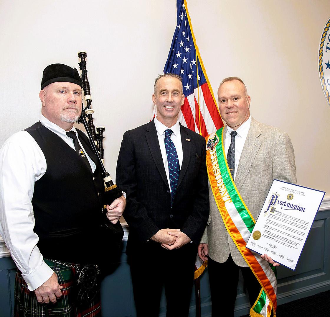 Town of Babylon Councilman Terrence McSweeney presents a proclamation declaring March as Irish American Heritage Month to Ancient Order of Hibernians St. Patrick’s Division 2 President Christopher Bradley and Vice President (and piper), Bob Farrell at Babylon Town Hall on March 11, 2026. AOH and LAOH members, Town of Babylon residents, and Supervisor Rich Schaffer were also in attendance. Photo courtesy of the Town of Babylon
