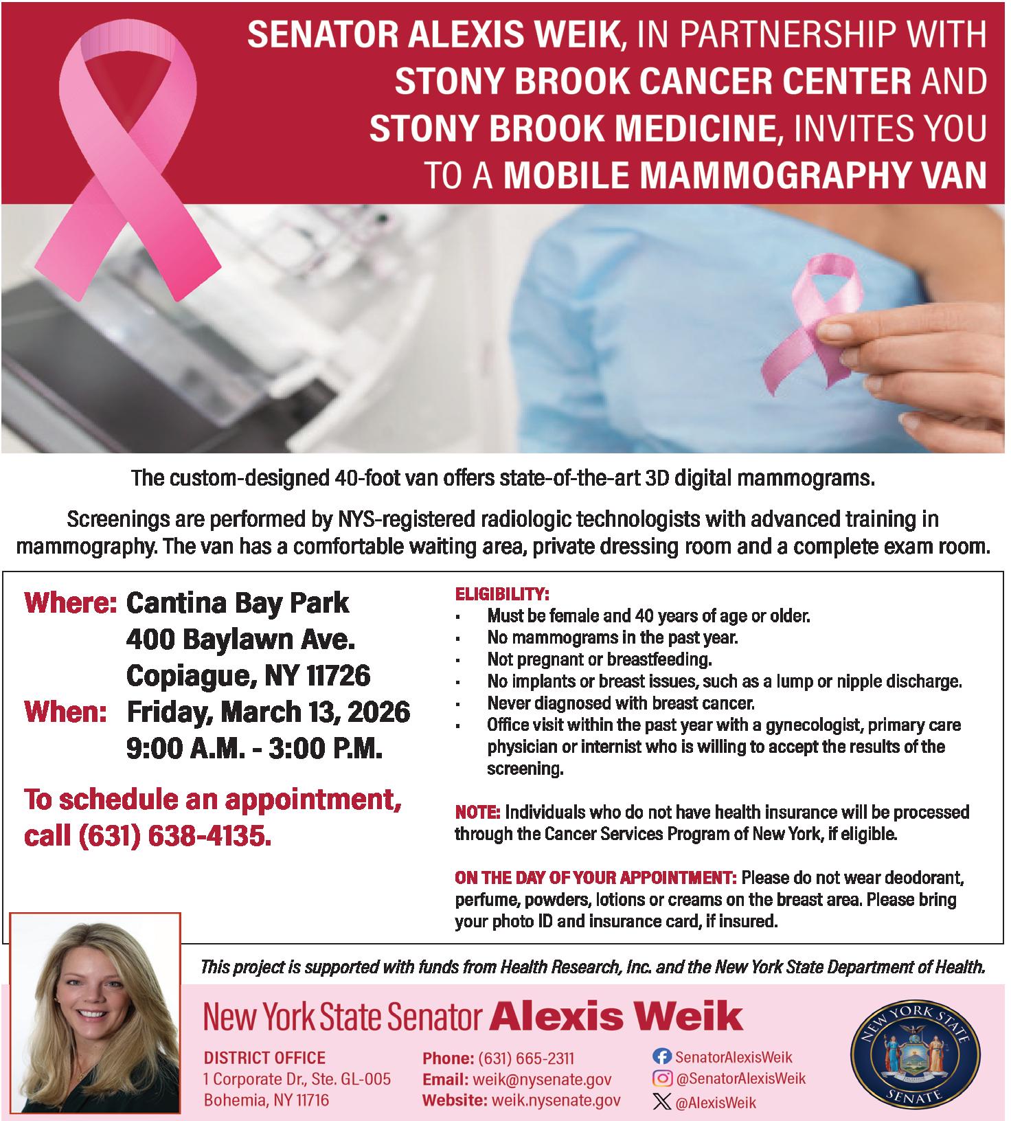 Suffolk Legislator Tom Donnelly (D-Deer Park) is pleased to inform Babylon and Huntington residents about the local Suffolk County Office for the Aging Winter 2026 Senior Advocate Schedule. Senior advocates are County representatives who come out into the community and assist seniors with information gathering, completion of eligibility or recertification applications and referrals to appropriate community agencies.
