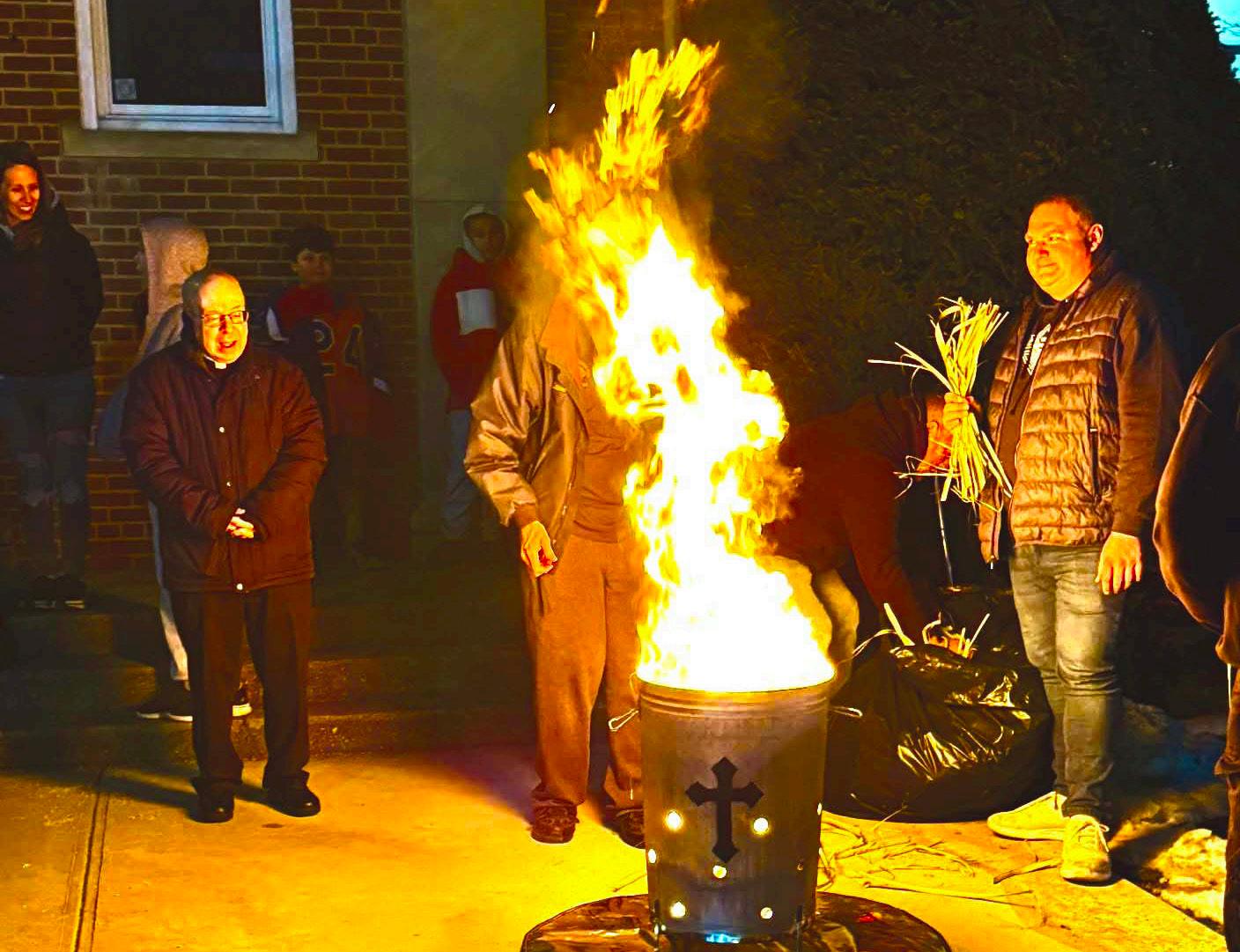 Members of the Our Lady of Perpetual Help Knights of Columbus recently led the parish’s traditional burning of the palms beside the church as the community prepared for Mardi Gras and the