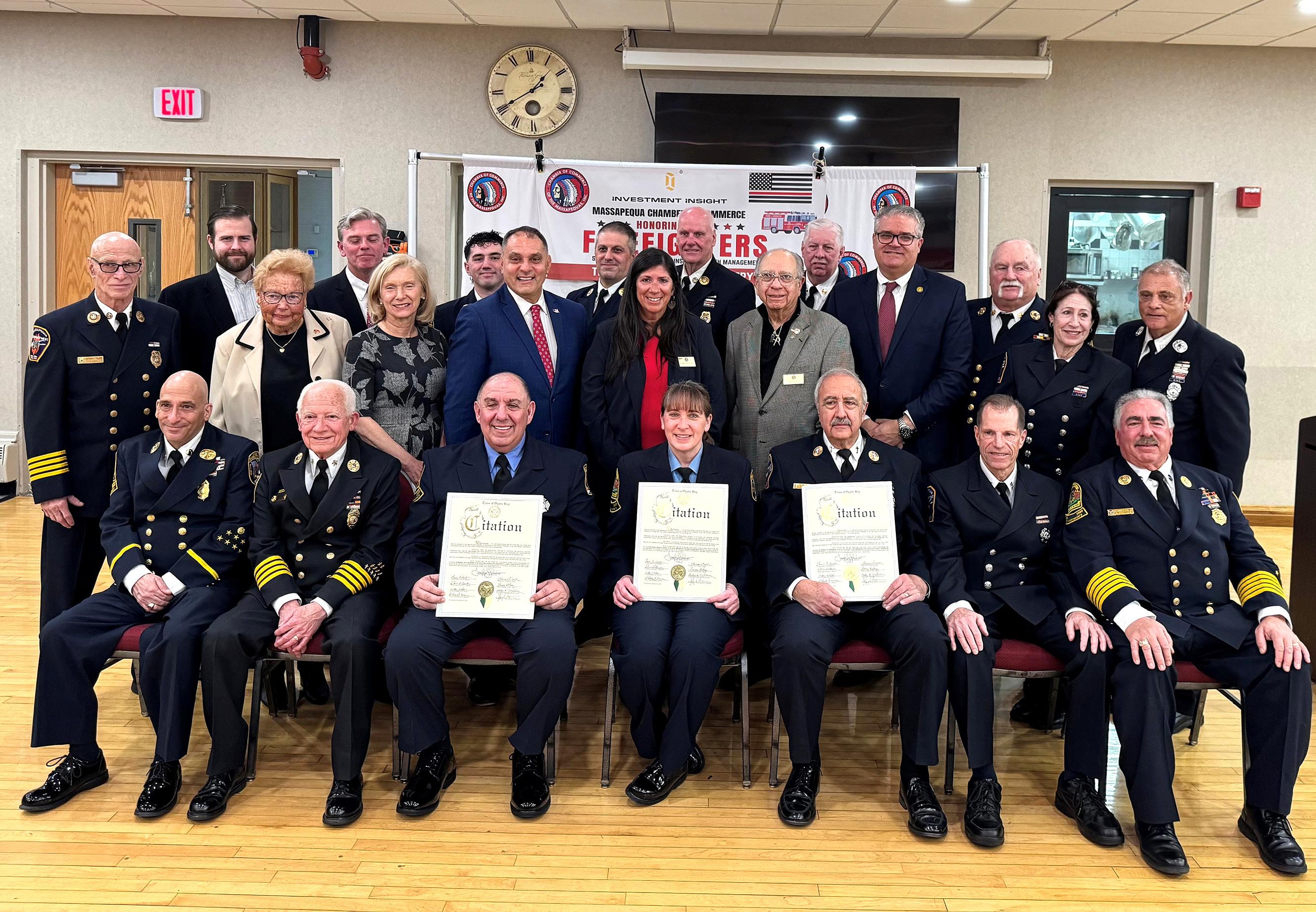 Oyster Bay Town Supervisor Joseph Saladino and Town Councilman Andrew Monteleone recently joined the Massapequa Chamber of Commerce at their Annual Volunteer Firefighters of the Year Awards Ceremony to honor the outstanding service and dedication of volunteer firefighters from both the Massapequa and North Massapequa Fire Departments. Honorees included ExCaptain Dept. Chaplain Ben Diventi of the Massapequa Fire Department Engine Company 1, Firefighter John Gennardo of the North Massapequa Fire Department Ladder Company 1, and Fire Medic Stephanie Seltzer of the North Massapequa Fire Department Engine 3.