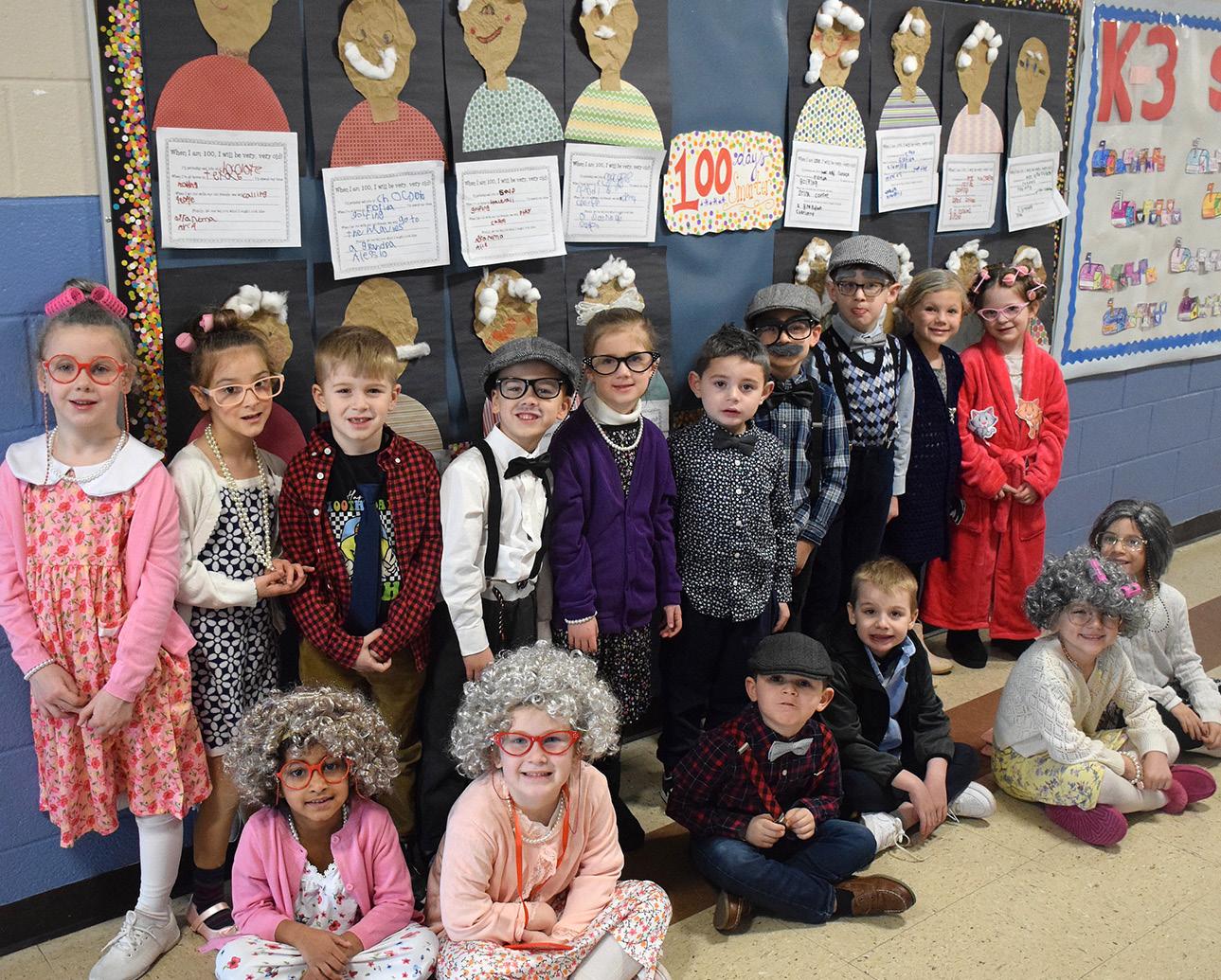 to school more than 2,300 times. Hitting the tripledigit mark of that 13-year journey was a big deal. Kindergartners dressed up as if they were 100 years old, donning glasses, wigs, dresses and suspenders and paraded through the school.