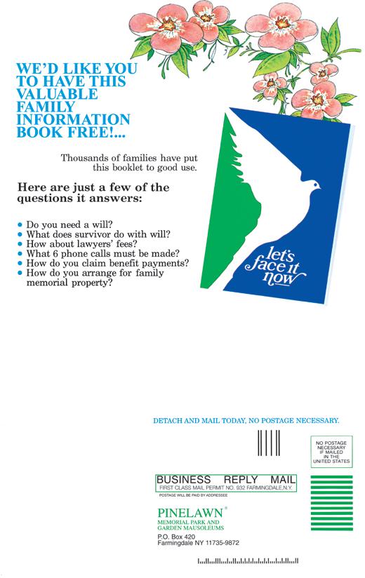 Print & Deliver Opportunities We have many print and deliver opportunities available, including but not limited to post cards, yers, menus and newsletters. Artwork can be done in house as well! Please see some of our sample pieces below. Have a special request? Please inquire today, as we can print and deliver almost anything! See some of our more unique samples here ork for User Defined (3.5" 5.427") La out: sample BRM Env th IMB.l October 15, 2010 y DAZzle, Version 9.0.05 1993-2009 nd Endicia. om U.S. Postal Service, Serial #NO PinelawnMemorialPropertyis AvailableforasLittleas$35aMonth. sionasafamilycalmly,unhurriedlyandat today’sprices. Returnthepostage-freepostcardtoday.We willsendyouafreecopyof“Let’sFaceIt Now,”abookleteveryfamilyshouldhave. Itwillbeyourstand-by“counselor,”ready toanswervitalfamilyquestionsatatime whenyoumusthavetheanswers.Italsohas asectiontorecordimportantfamilydata andrecords.We’llalsosendyouinformation onmemorialpropertyandonspaceinthe beautifulPinelawnGardenMausoleum. There’sabsolutelynoobligationandthefree Pinelawn Welcomes and Serves People of All Faiths and Religions Memorial Park & Garden Mausoleums Post Office Box 420 Farmingdale, NY 11735-9872 www.pinelawnmemorialpark.com Just fill out and return the attached form to receiveyour FREE copyof “Let’s Face It Now”! DATE MODIFIED: June 18, 2014 10:17 AM Job Name: DUMA397483_MW_3_SeptemberCouponBook_R6 Client: DUNKIN DONUTS Size/Trim: 14.25 10.0 in Zimmerman Advertising Region: Live Area: 14.0 x 9.625 in 6600 N. Andrews Avenue Publication: Bleed Size: 14.75 10.5 in Ft. Lauderdale, FL 33309 Artist: adrianaguirre Ink: 954.644.4000 Document Path: Department2:Creative:Retail:DUNKIN DONUTS:JOBS:2014:_DUMA_Dunkin Mid-Atlantic Region:DUMA397483_ MW_3_September Coupon Book:DUMA397483_MW_3_SeptemberCouponBook_R4.indd MONEYSAVING COUPONSINSIDE! Get iced and get going. Keep cool this summer. Enroll any DD card at DDPerks.com or on the Dunkin’ Mobile App & get a FREE medium beverage just for signing up. PERK YOUR FIRST : A FREE BEVERAGE Reward coupon to be redeemed in store. Visit DDperks.com for reward program terms and conditions. MSG and data rates may apply. Price and participation may vary. © 2014 DD IP Holder LLC.