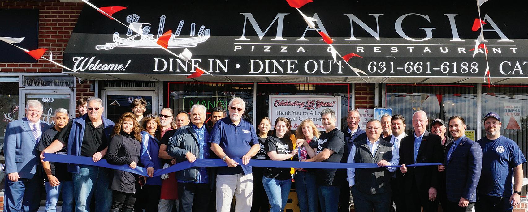 RIBBON CUTTING CEREMONY - The North Babylon Chamber of Commerce recently held a ribboncutting ceremony to celebrate the 35th Year Anniversary of Mangia Pizza located at 785 Deer Park Avenue in North Babylon. On hand to celebrate were owners John and Donna Mangiapane along with family and friends, Town of Babylon Supervisor Rich Schaffer, Councilman Terence McSweeney, Councilman Tony Martinez, and Councilman Anthony Manetta. Also in attendance were Suffolk County Legislator Tom Donnelly and Assemblyman Michael Durso. Photo courtesy of Ryan Williams, Director of I Babylon