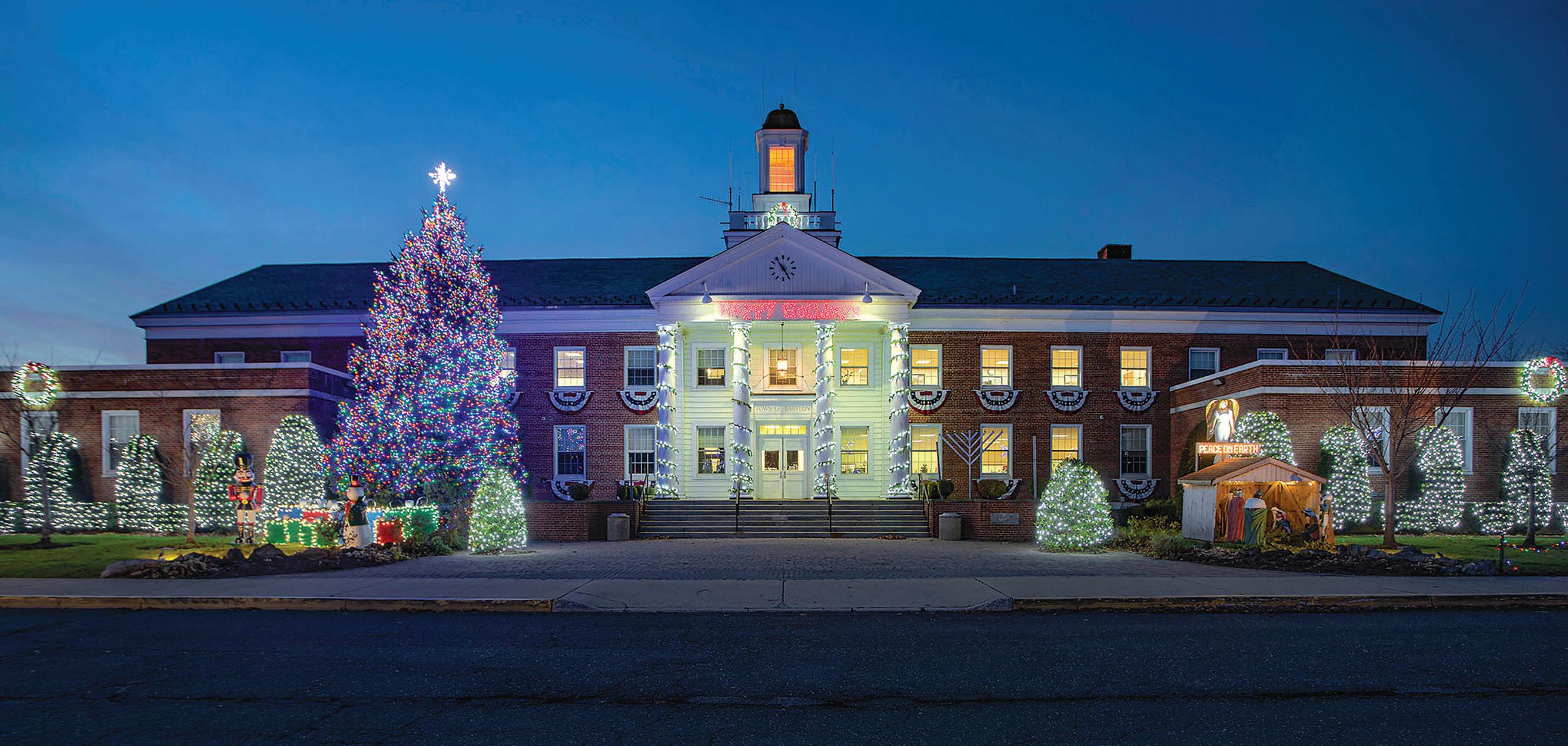 come on every evening at dusk, and we invite you and your family to walk around the grounds at Town Hall and take photos with all of the different holiday scenes. We wish you a wonderful holiday season!