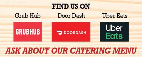 7 NORTH MASSAPEQUASOUTH BAY’S NEIGHBOR NEWSPAPERS WEDNESDAY, APRIL 17, 2024 • WWW.LONGISLANDMEDIAGROUP.COM 1 DOZEN GARLIC KNOTS PASTA DAY Complete Dinners 40 Choices of Pasta Includes: House Salad, Giovanni’s Fresh Garlic Knots, NY Cheesecake & Coffee or Tea Only With Purchase Of Large Pie Specialty Pies Not Included. Not to be combined with any other special. Valid Every Day Except Friday. With Coupon. Expires 4/24/24 Per Person No Coupon Necessary NO CHEESECAKE ON “TO GO” ORDERS $1895 COUPON WEDNESDAY Free Not to be combined with any other special. Expires 4/24/24 No Coupon Necessary Not to be combined with any other special. Expires 4/24/24 Per Person Take Out Only Take Out Only $2 OFF GRANDMA OR SICILIAN PIE LARGE REGULAR PIE MONDAY CHICKEN DAY CHOICE OF: Includes:Spaghetti,HouseSalad, GarlicKnots,NYCheesecake& Coffee or Tea CHICKEN CACCIATORE CHICKEN FRANCESE CHICKEN MUSHROOMS CHICKEN MARSALA GRILLED BREAST VODKA GRILLED CHICKEN BREAST CHICKEN PARMIGIANA CHICKEN PUTTANESCA CHICKEN PICCATA CHICKEN SCARPARIELLO $200 $2295 COUPON COUPON THURSDAY’S SPECIAL TUESDAY’S SPECIAL 421753N041724 All other dishes available in trays upon request. Bread or Garlic Knots included with trays. Deposit required on all orders. Tax additional. Giovanni Catering OFF NO CHEESECAKE ON “TO GO” ORDERS HALF TRAY FULL TRAY GLUTEN FREE PIZZA & PASTA NOW SERVING ROOM AVAILABLE FOR BIRTHDAYS, SHOWERS, ANNIVERSARIES, GRADUATION AND ALL SPECIAL OCCASIONS (UP TO 50 PEOPLE) HOUSE SALAD 40.00 67.00 GREEK SALAD 50.00 87.00 CAESAR SALAD 45.00 77.00 CHICKEN FINGERS 45.00 87.00 FRESH MOZZARELLA & TOMATO 55.00 102.00 BROCCOLI RABE & SAUSAGE 65.00 120.00 BAKED CLAMS 60.00 110.00 FRIED CALAMARI 60.00 110.00 SWEET CHILI CALAMARI 60.00 110.00 COLD ANTIPASTO 55.00 100.00 MEATBALLS IN TOMATO SAUCE 55.00 110.00 SAUSAGE IN TOMATO SAUCE 55.00 110.00 PENNE ALA VODKA 60.00 110.00 STUFFED SHELLS 60.00 110.00 LASAGNA 65.00 120.00 PENNE WITH BROCCOLI AND CHICKEN 60.00 110.00 LINGUINE WITH WHITE CLAM SAUCE 65.00 120.00 LINGUINE WITH RED CLAM SAUCE 65.00 120.00 BAKED ZITI 60.00 110.00 PENNE ANTIONIO 65.00 120.00 SAUSAGE & PEPPER PIZZAIOLA 65.00 120.00 MUSSELS MARINARA 55.00 100.00 CALAMARI MARINARA 70.00 130.00 CHICKEN MARSALA 70.00 120.00 CHICKEN PARMIGIANA 70.00 120.00 CHICKEN FRANCAISE 70.00 120.00 CHICKEN GIOVANNI 75.00 140.00 CHICKEN CACCIATORE (BONELESS) 70.00 125.00 EGGPLANT PARMIGIANA 65.00 120.00 EGGPLANT ROLLATINE 65.00 120.00 VEAL CUTLET PARMIGIANA 75.00 140.00 VEAL SCALLOPINE PIZZAIOLA 75.00 140.00 VEAL MARSALA 75.00 140.00 VEAL GIOVANNI 80.00 150.00 SHRIMP PARMIGIANA 90.00 170.00 SHRIMP SCAMPI 90.00 170.00 WWW.GIOVANNISOFMASSAPEQUANY.COM 5612 MERRICK ROAD, MASSAPEQUA Across From Lidl Supermarket (516)799-7326 • (516)798-5217 Open Mon.-Thurs. 11am-10pm; Fri. & Sat. 11am-11pm, Sun. 12 Noon - 10pm