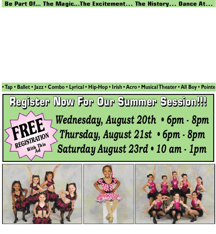 Excitement... The History... Dance At... • Tap • Ballet • Jazz • Combo • Lyrical • Hip-Hop • Acro • All Boy - Large Spacious Facility With Three Dance Rooms, A Comfortable Lobby And Separate Dressing Area - Full Time Office Staff To Assist You During Class Times - Ample, Well Lit Parking Area - Oversized Viewing Windows In All Rooms - Affordable Tuition, Easy Payment Plans, Multi-Class Discounts - Professional, Experienced, Adult Teachers - Recreational Classes Geared Towards Promoting Self Esteem, Social Skills And Discipline - Competitive Classes Geared For The More Serious Dance Student - Pre-School To Adult-Beginner To Advanced Classes Available Why Choose Center Stage Dance Studio? Director: Jeanette Mangulis 1011 Route 109, Farmingdale • 516-293-2019 www.csdancestudio.com • (Meat Farms Shopping Center) 414787N081623 Call Or Email For Further Information 516-293-2019 csdance@ymail.com Classes Begin September 11th FALL REGISTRATION DATES: TUESDAY AUGUST 22ND 5-7PM TUESDAY SEPTEMBER 5TH 5-7PM Pre-School Starting From Age 2! Adult Classes
