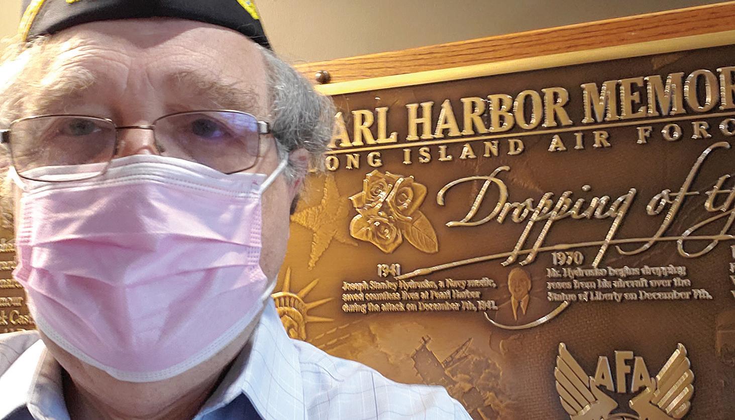 Air Force Veteran Ed Freeberg from West Hempstead in front of a Pearl Harbor Memorial Plaque.