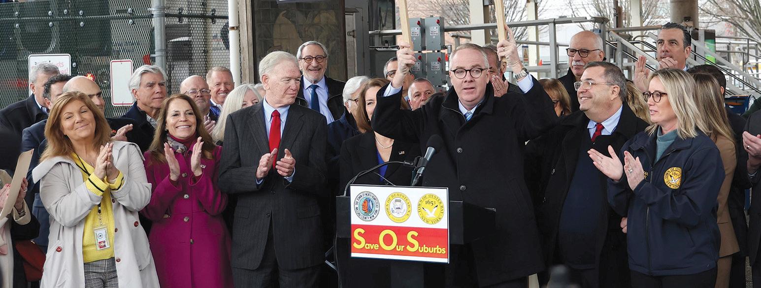 LEADERS UNITE AGAINST GOV’S HIGH DENSITY HOUSING PLAN - Teaming up in a united front against the resurgence of Governor Kathy Hochul’s proposal for high density housing in single-family neighborhoods on Long Island, Town of Hempstead Supervisor Don Clavin, Town of North Hempstead Supervisor Jen DeSena and Town of Oyster Bay Supervisor Joseph Saladino – along with a chorus of village mayors, state senators and other elected officials across Nassau and Suffolk counties –descended on the Port Washington Train Station, one of many railroad stations targeted by the Governor for the purposes of developing high-density housing, to protest the Governor’s “attack on the suburbs.”