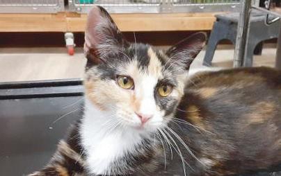 STORMIE Calico female. Approximately 1 year old. Friendly and playful.
