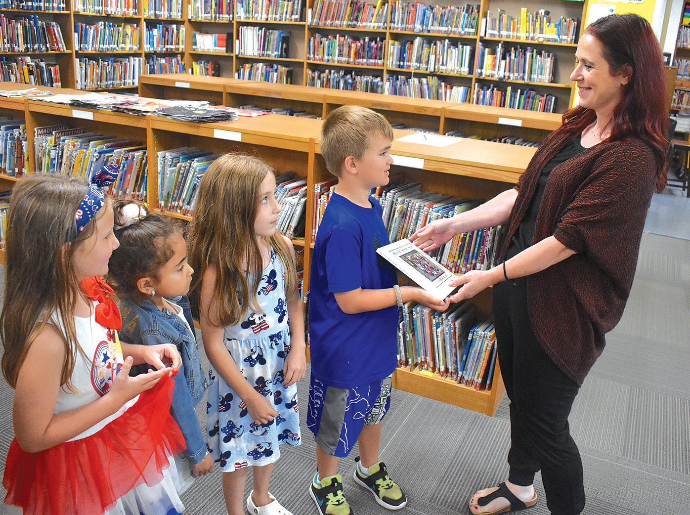 PRESENTED A COPY TO THE LIBRARIAN - First graders, from left, Campbell Cibello, Ariana DiFilippi, Brooke Blasco and Donovan Garvey presented a copy of the book to librarian Jennifer Rosenberg. Photo courtesy of the Seaford School District