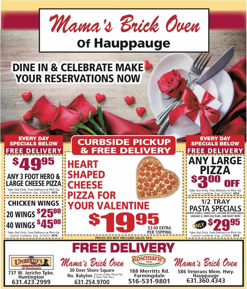 SUFFOLK ZONE 2NEIGHBOR NEWSPAPERS WEDNESDAY, MARCH 15MARCH 28, 2023 • WWW.LONGISLANDMEDIAGROUP.COM 4 737 W. Jericho Tpke. Huntington 631-423-2999 30 Deer Shore Square North Babylon 631-254-9700 586 Veterans Memorial Hwy. Hauppauge 631-360-4343 188 Merritts Rd. Farmingdale 516-531-9801 Say You Saw The Hometown Shopper July 15, 2021 -FARMINGDALE/N. MASSAPEQUA COMBO COMBO1/2 TR AY ANTIPASTO SALAD FR EE DE LI VE RY FR EE DE LI VE RY ANYL ARGE PIZZ A ANYL ARGE PIZZ A DINING ROOM NOWOPEN FORTABLE SERVICE PART YROOMS AVAILABLE CALL FORINFORMATION •ANY 3FOOT HERO •24GARLICKNOTS •DOZEN CHICKEN WINGS •LARGE CHEESE PIE $1995 $3895 $3600 ONLY $1695 $2495 With coupon. Cannot combine. Exp. 7/22/21. With coupon. Cannot combine. Exp. 7/22/21. With coupon.Cannotcombine.Exp.7/22/21 With coupon.Cannotcombine. Exp. 7/22/21. CHICKEN WINGS 20 WINGS 40 WINGS $300 OFF $300 OFF 409748AN031523 Exp. 3/1/23 NN ORDER NOW 1/2 TRAY PASTA SPECIALS Take Out Only. Free Delivery or Pick-Up Cannot Combine. Limit 10 Pizzas. Exp. 3/1/23 NN Take Out Only. Free Delivery or Pick-Up Cannot Combine. Limit 10 Pizzas. Exp. 3/1/23 NN $18 95 GRANDMA PIZZA $ 17 95 BAKED ZITI OR CHEESE RAVIOLI BRICK OVEN PIZZA $ 1295 Cannot combine with any other offers. Expires 4/7/23 HP MONDAY NIGHT SPECIALS SICILIAN PIE PASTA NIGHT LARGE CREAMY SPINACH ALFREDO PIZZA $10 95 12 pastas to choose from $4 off $ 300OFF CHICKEN WINGS $2500 $4500 20 WINGS 40 WINGS Take Out Only. Free Delivery or Pick-Up Cannot Combine. Limit 10 Pizzas. Exp. 4/7/23 HP ANY 3 FOOT HERO & LARGE CHEESE PIZZA Take Out Only. Free Delivery or Pick-Up Cannot Combine. Limit 10 Pizzas. Exp. 4/7/23 HP $ 4995 1/2 TRAY PASTA SPECIALS Take Out Only. Free Delivery or Pick-Up Cannot Combine. Limit 10 Pizzas. Exp. 4/7/23 HP $ 2995 PENNE VODKA, BAKED ZITI, LINGUINI W/CLAM SAUCE, SAUSAGE & BROCCOLI ONLY ANY LARGE PIZZA $ 300OFF Take Out Only. Free Delivery or Pick-Up Cannot Combine. Limit 10 Pizzas. Exp. 4/7/23 HP Cannot combine with any other offers. Expires 4/7/23 HP Cannot combine with any other offers. Expires 4/7/23 HP Cannot combine with any other offers. Expires 4/7/23 HP Cannot combine with any other offers. Expires 4/7/23 HP
