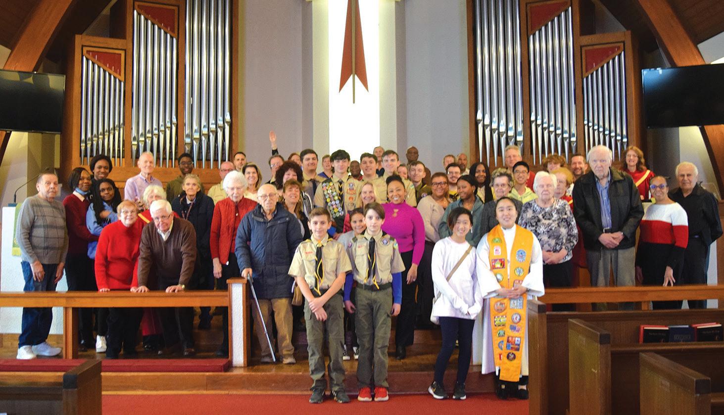 Boy Scout Troop 125 (Commack) Boy Scouts and adult scouting volunteer leaders pose for a photo with Pastor Roslyn Lee and members of the church community following the Scout Sunday service at Commack United Methodist Church (Commack) on February 12th. Commack United Methodist Church, which hosts Boy Scout Troop 125, was one of several Matinecock District (ScoutsBSA)’s Host Churches for the Protestant Faith during the start of National Boy Scout Week.