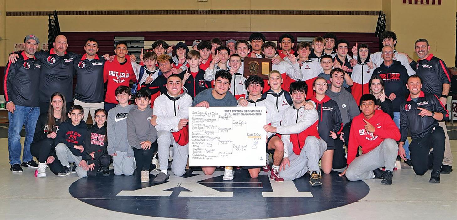 East Islip High School’s varsity wrestling team recently captured the Suffolk County Division I Dual Meet Championship in front of over 1,500 spectators at Bay Shore High School. Led by captains Stephen Coleman, Sebastian Regis, Justin Shayew and James Sturek, The Redmen were able to defeat William Floyd, Northport and Connetquot before facing the tough defending champions Brentwood in the finals.