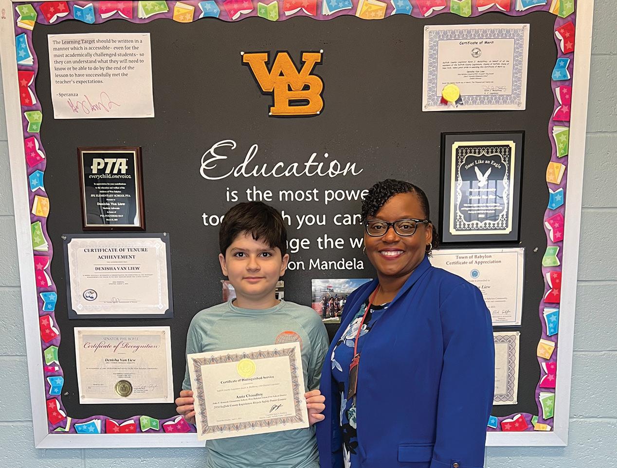 JFK FIFTH GRADER NAMED POSTER CONTEST WINNER - Congratulations to fifth grader Aariz Chaudry from John. F. Kennedy Elementary School in the West Babylon School District, who was named a winner in the 2024 Bicycle Safety Poster Contest sponsored by Suffolk County. Chaudry’s poster was one of two chosen to represent District 15. He was recently presented a certificate from Legislator Jason Richberg for his participation. He is pictured with John F. Kennedy Elementary School Principal Denisha Van Liew. Photo courtesy of West Babylon School District