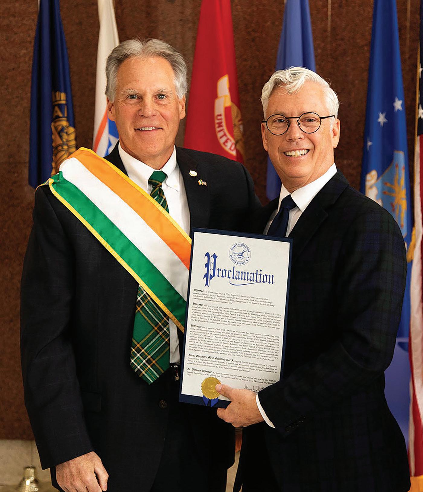 Legislator Steven J. Flotteron recognized James J. Killen as the 11th Legislative District’s honoree at the 2nd Annual Irish American Heritage Celebration held at the H. Lee Dennison Bldg. in Hauppauge. This honor is for his life-long commitment in promoting Irish culture. Killen is a fourth generation Hibernian, as his great grandfather, Patrick J. Killen joined the AOH in New York City shortly after arriving from the Dundrum area of County Down in the late 1800s. His grandfather, also Patrick J. Killen, left County Down for NYC at the age of