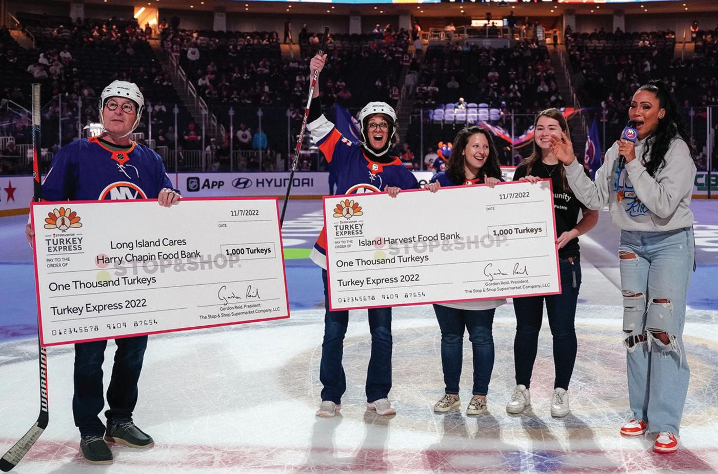 PROGRAM - Paule Pachter, Chief Executive Officer of Long Island Cares (far left) and Randi Shubin Dresssner, President & CEO, of Island Harvest (2nd from left) took part in a charity shootout between the first and second period of Islanders- Flames game at the UBS Arena, as Stop & Shop donated one thousand Thanksgiving turkeys each to Long Island’s two food banks. Stop & Shop’s Stefanie Shuman (2nd from right) and Shanon Karafian (far right) looked on. The donation is part of Stop & Shop’s Turkey Express program, in which the Supermarket donated 25,000 Thanksgiving Turkeys to food banks across five states.