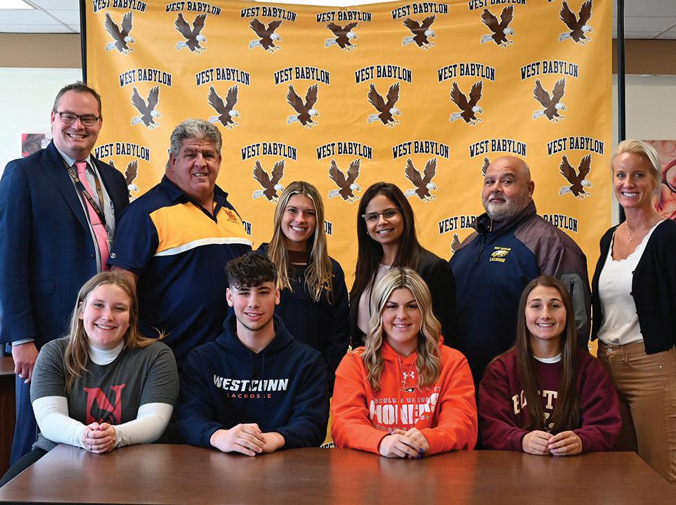 STUDENT-ATHLETES SIGN ON TO PLAY IN COLLEGE - Alongside their coaches, family members and administrators, four student-athletes from West Babylon Senior High School put pen to paper on Nov. 9 as they signed national letters of intent to continue their respective sports in college. The district congratulates the following students: Lacey Downey, Boston College, lacrosse; Savana Lippe, Newberry College, field hockey; Anthony Raccomandato, Western Connecticut State University; and Riley Vergano, Tusculum University, lacrosse. Photo courtesy of West Babylon School District