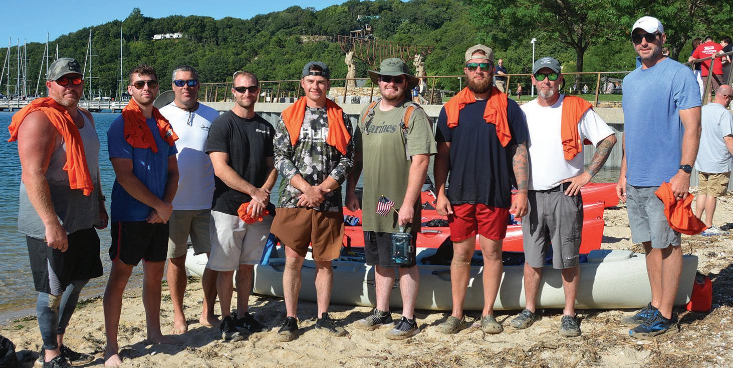 SHINING A LIGHT ON PTSD AND VETERAN SUICIDE - A group of military veterans who are PSEG Long Island employees recently took to the water to raise awareness of mental health issues afflicting many veterans. The group was among 22 veterans participating in the fifth “22 PTSD Awareness Challenge” (22PAC) event, an arduous, 22-mile kayaking trip from Bridgeport, Conn. to Port Jefferson to help shine a light on veteran PTSD and end veteran suicide. Pictured (l-r): PSEG Long Island employee-military veterans Thomas Leuschner, Evan Rohman, Richard Rohman, Matthew Testagrose, Michael Probst, Devin McLaughlin, Michael Pira, Leo Tolson and Thomas Sketch after a 22-mile kayaking trip to increase awareness about PTSD and veteran suicide.
