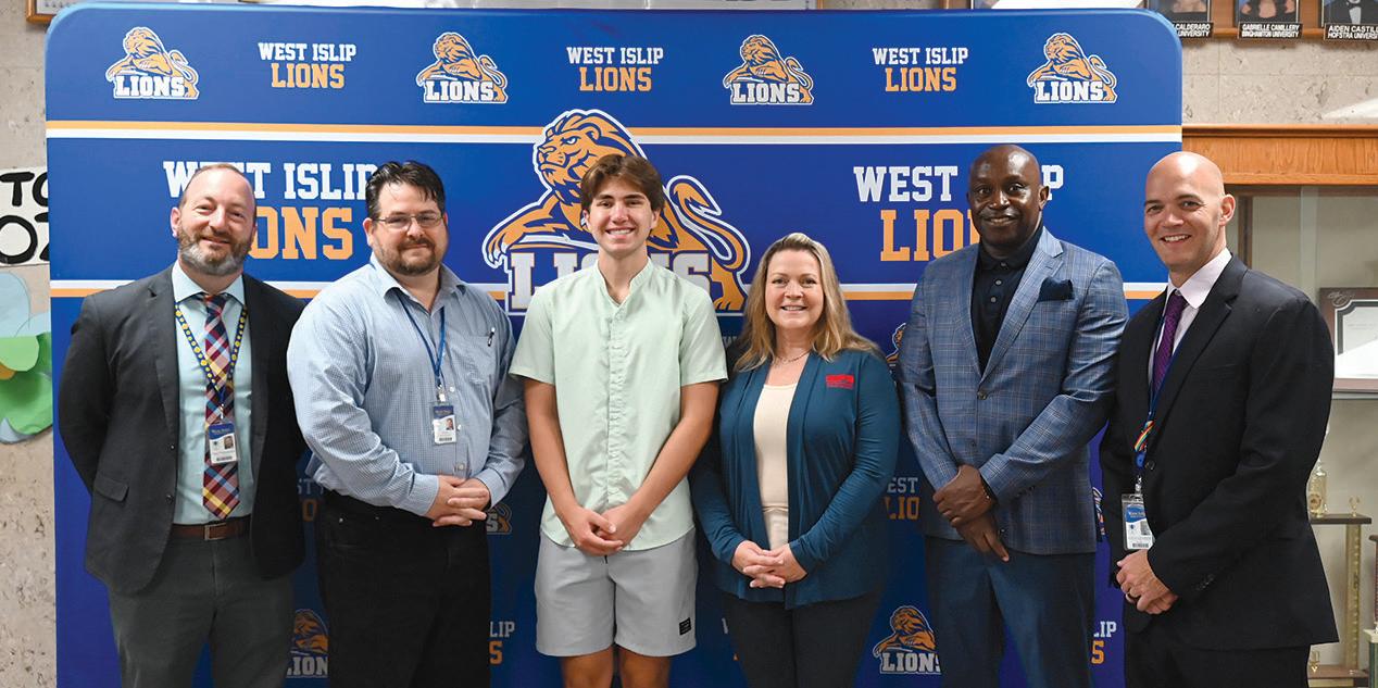 ROBERT MINEO AWARDED SCHOLARSHIP, JOB OPPORTUNITY - From left, West Islip School District Superintendent of Schools Dr. Paul Romanelli, West Islip High School technology teacher Brian Buonomo, Robert Mineo, Designatronics director of human resources Maureen Rubendall, West Islip High School Principal Dr. Anthony Bridgeman and West Islip School District director of technology and innovation Dr. Patrick Kiley-Rendon. Photo courtesy of West Islip School District