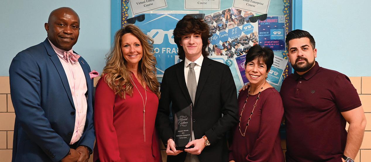 PERFECT SCORE - West Islip High School senior Alexander Miranda scored a perfect 7 on his 2022 International Baccalaureate Business and Management assessments. From left, West Islip High School Principal Dr. Anthony Bridgeman, IB Business and Management teacher Patricia Morgigno, Alexander Miranda, business teacher Joanne Macrelli and guidance counselor Yianni Koroneos. Photo courtesy of West Islip School District