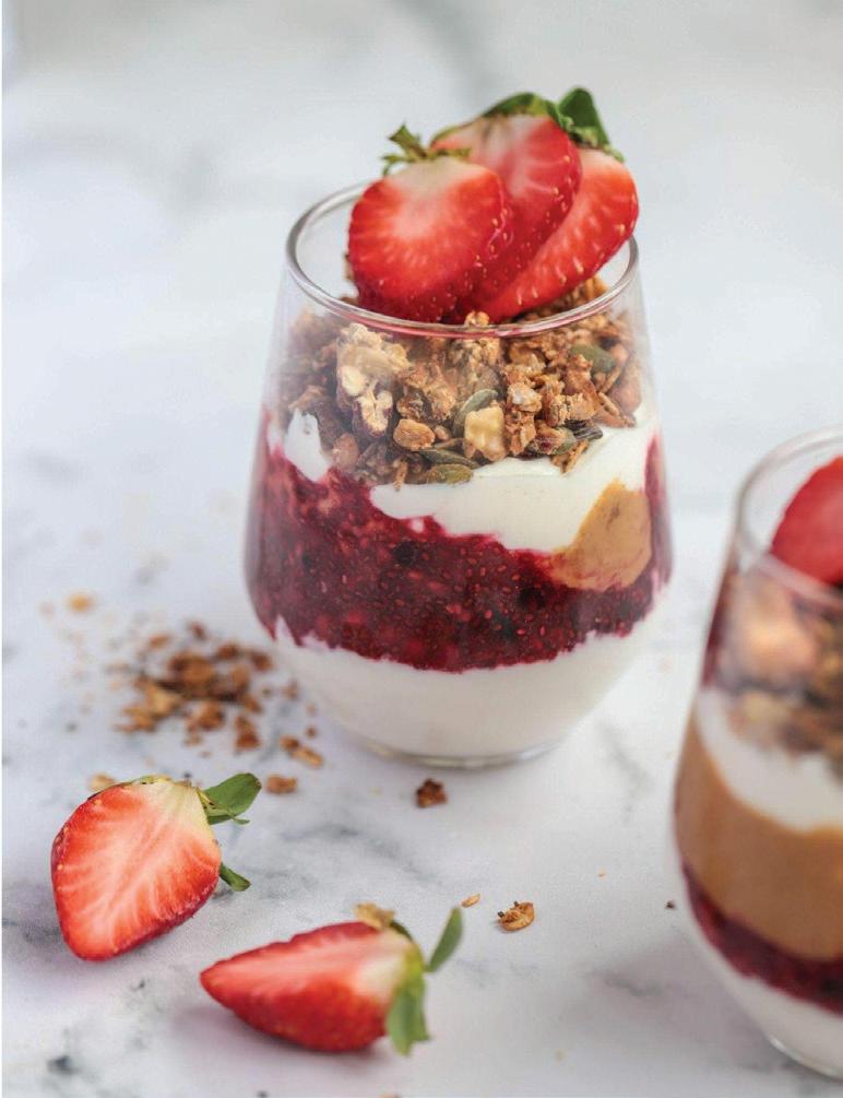 For each parfait, divide the yogurt between 3 serving glasses or bowls. Top with layers of the peanut butter and chia jam. Repeat each layer and chill until ready to serve. When ready to serve, top with granola and strawberries.