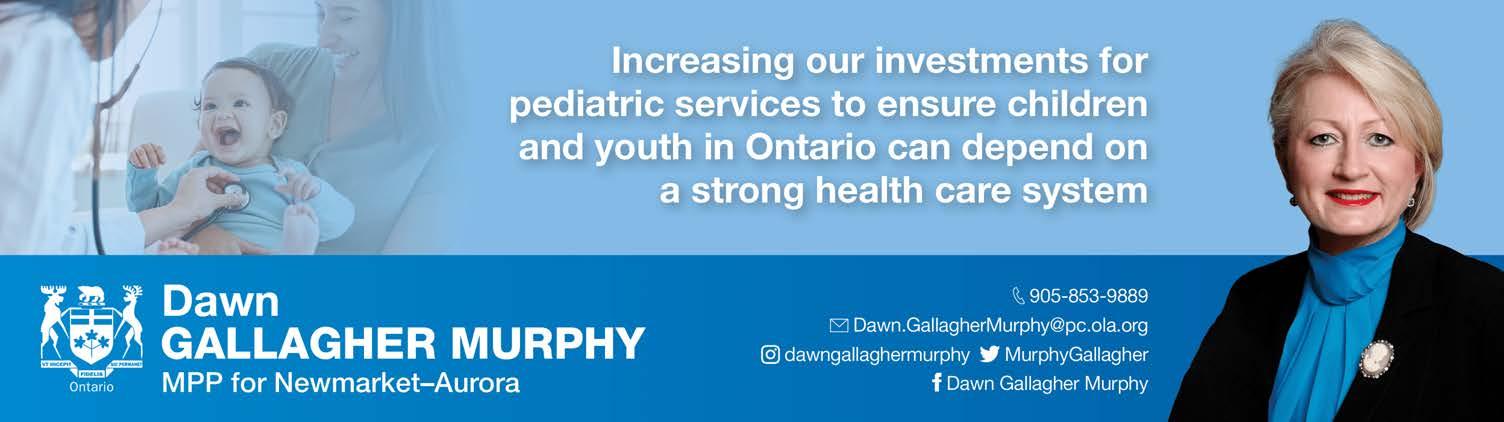 The Ontario government is investing an additional $330 million each year in pediatric health services to connect children and youth to more convenient and high-quality care close to home at hospitals, clinics, and community-based health care facilities across Ontario. With this new investment, over 100 high-priority initiatives will be quickly implemented to ensure children and youth in every corner of the province can connect to emergency care, surgeries, ambulatory services, diagnostic imaging, and mental health services. This consistent and stable funding increase will also allow pediatric hospitals to make significant increases to sta ng to ensure they have the people and resources needed to prevent backlogs and improve access to care. Through the Sustainable Canadian Agricultural Partnership (Sustainable CAP), the governments of Canada and Ontario are committing more than $68 million in the Ontario Agricultural Sustainability Initiative (OASI) to fund three programs designed to support farmers in making their agricultural lands more productive and resilient. To learn more about these investments and more, visit my website at dawngallaghermurphympp.ca.