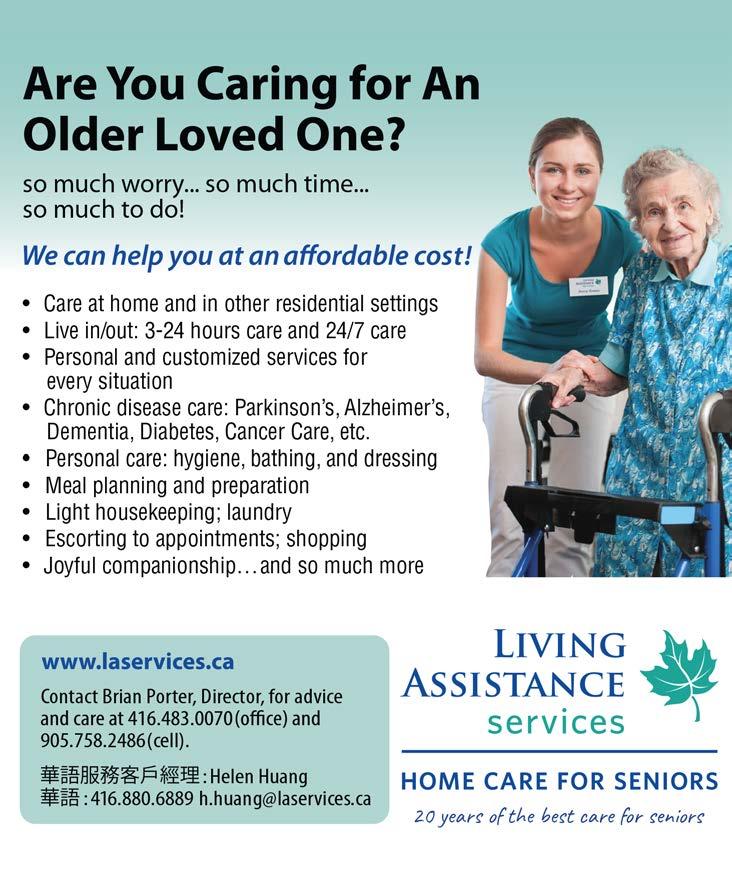 For advice about seniors and care at home in the Regions of York, Georgina and Simcoe, please contact Brian Porter, Director of LAS, at 416-483-0070 (o ce), 905-758-2486 (cell) or 416.483.0070 (office), 905.758.2486 (cell), or b.porter@laservices.ca or visit www.livingassistance.ca
