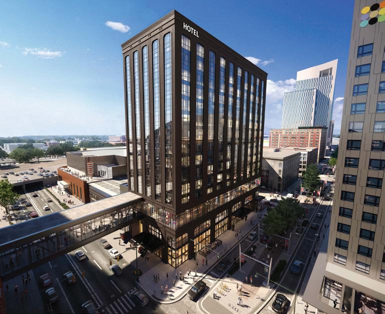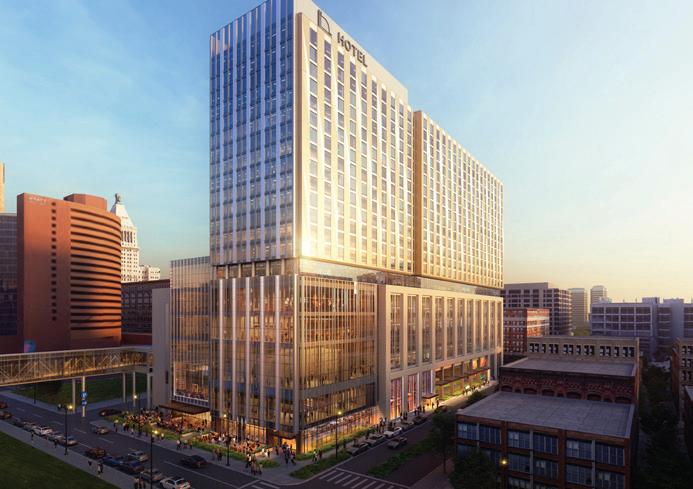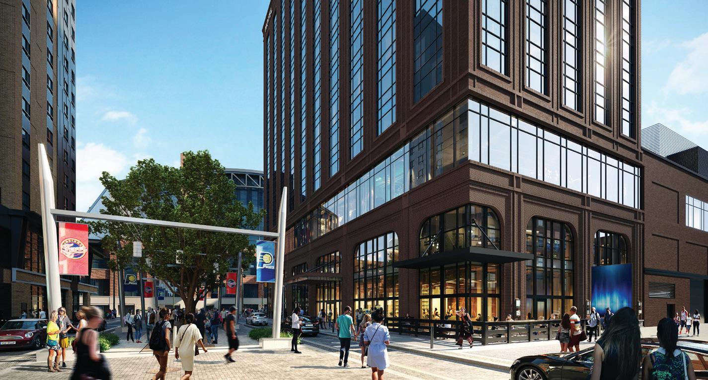 11,500 square feet of ballroom and meeting spaces, a fitness center and spa, an outdoor terrace, an upscale restaurant, a lobby bar and restaurant space, and a private lounge for hotel guests. A third-floor pedestrian bridge will connect the hotel to Gainbridge Fieldhouse and the project will also include a two-level underground parking garage.