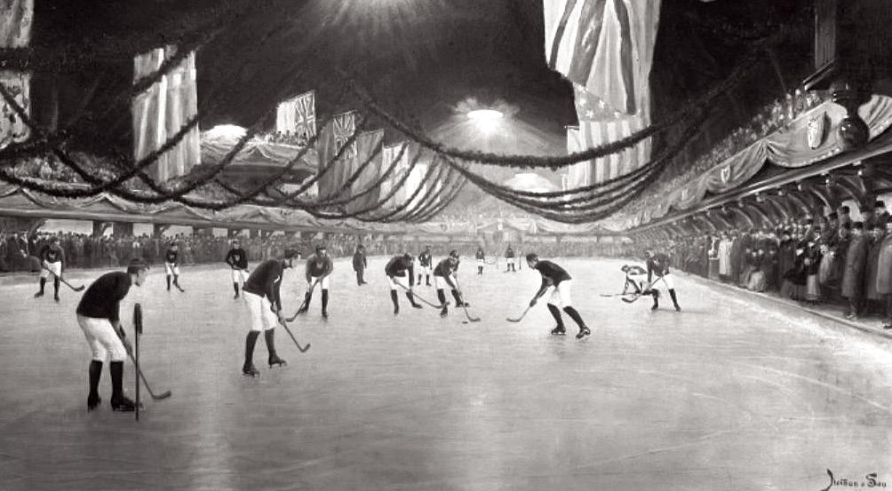 Composite photo of an 1893 hockey game at the Victoria Skating Rink in Montreal, Quebec. This was the site of the famous hockey game played on March 3, 1875, which the IIHF officially recognizes as the first game of organized ice hockey. | PUBLIC DOMAIN
